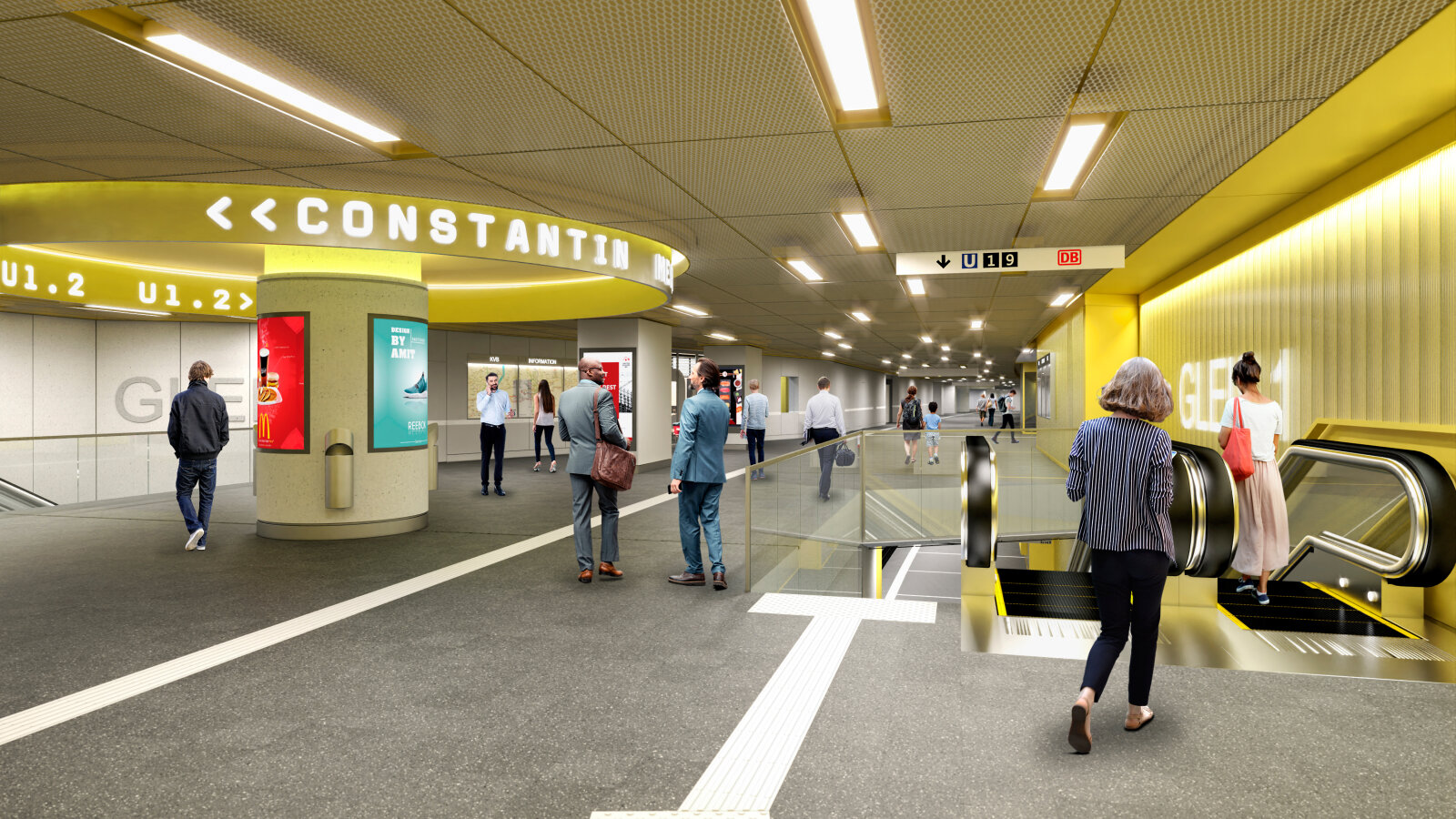 Wir möchten die unübersichtliche Situation der Haltestelle durch einheitliche, reduzierte und klare Formen und Materialien zu beruhigen. Konkret planen wir die Gestaltung der Wände mit durchsichtig hinterleuchtetem Glas und einer Fassade aus Betonelementen. Auch werden wir die Haltestelle durch eine klare Raumstruktur verbessern, um die Orientierung zu erleichtern.
