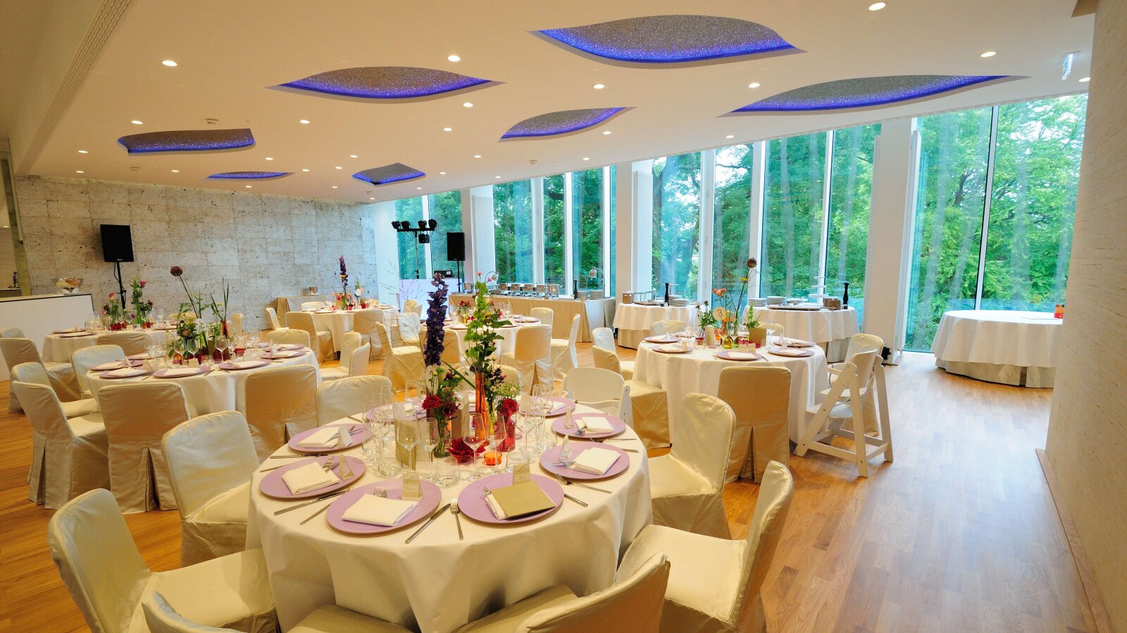 Der Parksalon im Obergeschoss des gläsernen Anbaus überrascht Ihre Gäste mit einem ungestörten Blick ins Grüne. Auf 130 Quadratmetern bietet er für Hochzeiten mit bis zu 120 Gästen den passenden Rahmen.