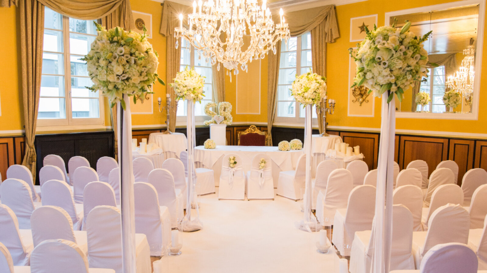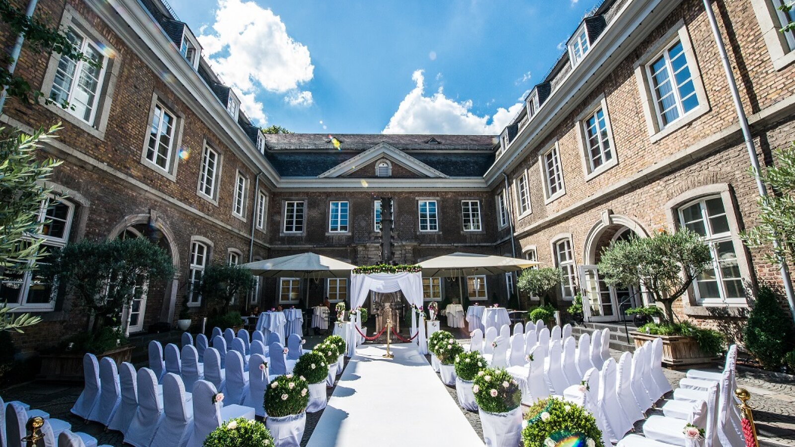 Verschiedene unterschiedlich große, repräsentative Räume stehen Ihnen für Ihre Trauung und Hochzeitsfeier zur Auswahl. Wenn das Wetter es zulässt, können Sie auch gerne im romantischen Innenhof vor einer Original-Stele des Kölner Doms heiraten.