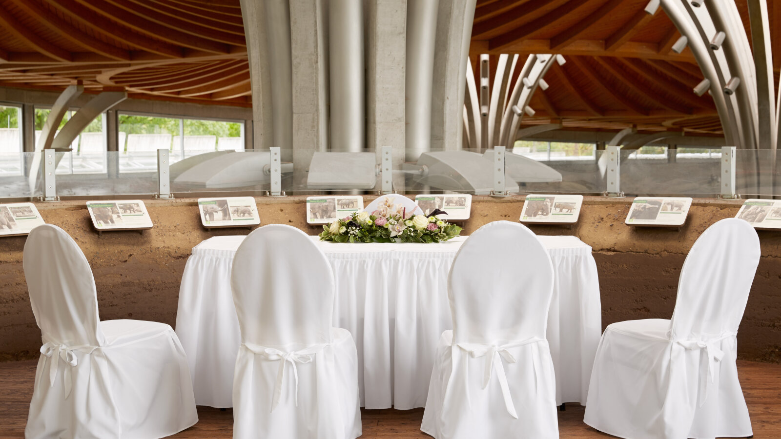 Für Paare, die sich ein exotisches Ambiente wünschen, ist unser Elefantenpark der richtige Ort. Hier bieten wir Ihnen einen festlich dekorierten Bereich auf der Empore unseres Elefantengeheges.