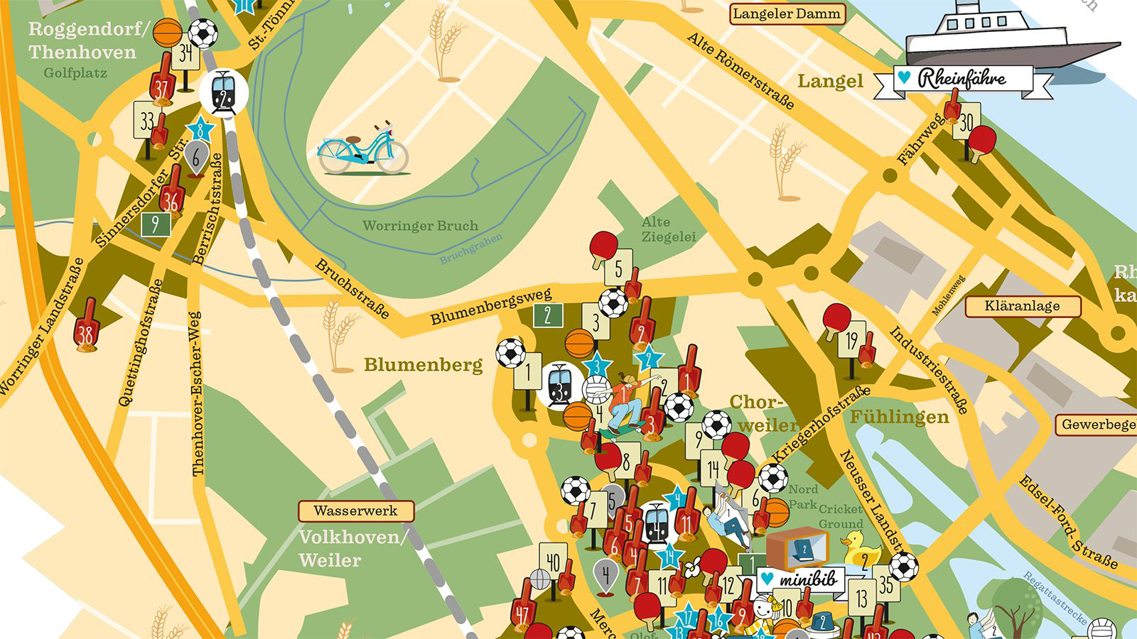 Ihr findet darauf Spielplätze, Bolzplätze, Grundschulen, Museen, Skate-Anlagen und ganz viele andere spannende Dinge. Ihr erfahrt, welcher Ort Oberbürgermeisterin Henriette Reker am besten in dem Bezirk gefällt und den Lieblingsort von Karla dem Känguru.