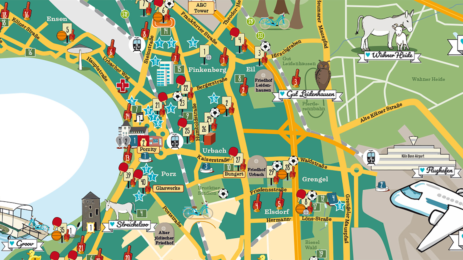 Für die ganz jungen Bewohner*innen unserer Stadt gibt es einen ganz eigenen Stadtplan. In Zusammenarbeit mit dem Känguru Colonia Verlag haben wir Kinderstadtpläne entwickelt, damit ihr eure Veedel und Bezirke kennenlernen und so ein eigenes Gefühl für eure Stadt entwickeln könnt.