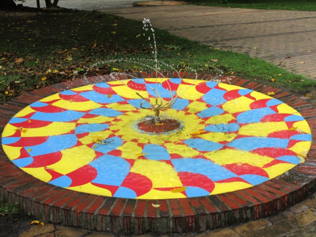 Der Brunnengarten bestehend aus zehn Rheinkieselbrunnen und vier bunten Brunnenschalen wurde 1957 zur Bundesgartenschau im Rheinpark gebaut.