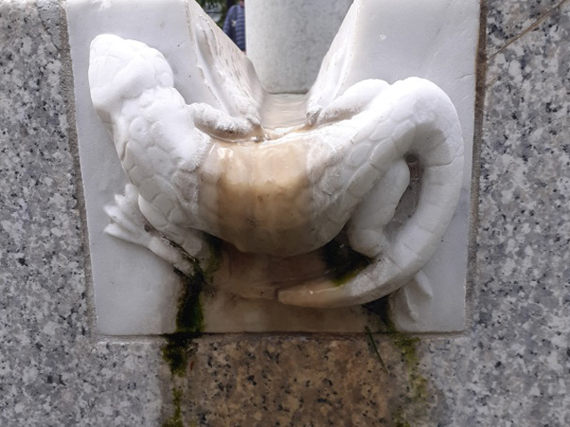 Der Brunnen wurde aus Granit, Marmor und Bronze gefertigt. Er hat eine klassische Form aus Brunnenschale und Brunnenstock, an dessen oberem Ende das Wasser aus vier Bronzerohren tritt und am Brunnenbecken von vier Ausgüssen abgeleitet wird. Diese sind mit verschiedenen Tierdarstellungen verziert, unter anderem einer Schildkröte und einer Eidechse. Eine bronzene Schlange richtet sich aus dem Wasserbecken empor.