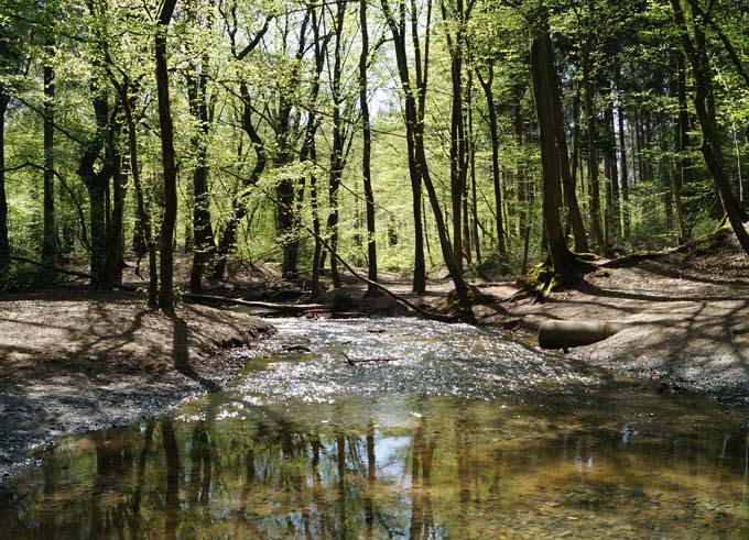 Die Abfahrt ist bequem und teilweise asphaltiert. Ein Tipp: Auf dem Rennweg sollte, wer noch nicht müde ist, nach links statt nach rechts in den Rath-Forsbacher-Weg abbiegen und eine Erfrischung in der 600 Meter entfernten Wassertretstelle (5) nehmen. Der Giesbach füllt sie. Ihre Lage ist imposant. Die drei Stadtgebiete auf denen sich der Königsforst erstreckt - Köln, Bergisch Gladbach und Rösrath - treffen dort aufeinander.