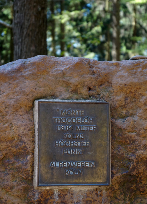 Zwischenzeitlich führt die Route nun nicht mehr entlang, sondern über den Flehbach. Er entspringt am höchsten Berg des Königsforstes, dem Tütberg (212 Meter über N.N.). Sein Gipfel liegt auf Bergisch Gladbacher Gebiet. Anders die Spitze des Monte Troodelöh (4): Mit exakt 118,04 Metern über N.N. ist er Kölns höchster Berg. Sein kurzer "Aufstieg" verläuft steil, weshalb Schieben keine Schande ist. Zumal auch die drei "Erstbesteiger" zu Fuß ankamen: Troost, Dedden und Löhmer. Sie schenkten dem bis 1999 namenlosen Berg die Anfagssilben ihrer Namen: Troo-De-Löh. Damals fanden sie weder Gipfelbuch noch Stempel vor. Inzwischen gehören beide Utensilien zum festen Inventar, sofern nicht wieder Langfinger unterwegs waren.