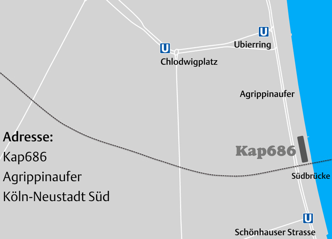 Das KAP686 befindet sich am Agrippinaufer in Nähe der Südbrücke in der Neustadt/Süd.