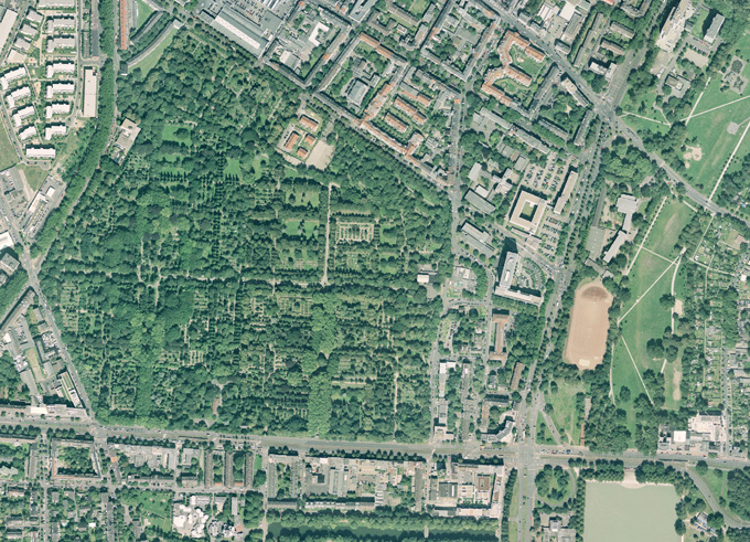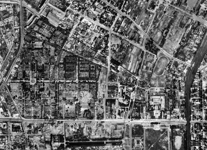 Nicht nur anhand der Stadtpläne, sondern auch auf den Luftbildern wird die Veränderung des Friedhofs sichtbar.