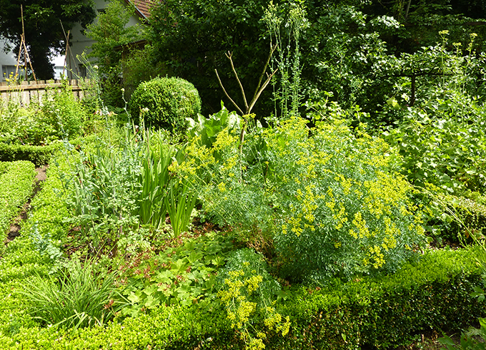 Wie in einem klassischen Bauerngarten wird auch hier das Schöne mit dem Nützlichen kombiniert. Es gibt sowohl bunte Blumen als auch Heilpflanzen, Küchenkräuter, Obst und Gemüse. Kleine Buchsbaumhecken umranden die Beete und sollen Wühlmäuse fernhalten. Umrahmt wird der Garten von einem Spalierapfel und Johannisbeersträuchern.