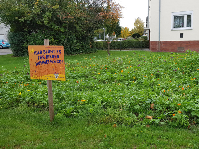 Um Naturerleben auch im direkten Wohnbereich zu ermöglichen, wurden in einem Kooperationsprojekt des Amtes für Wohnungswesen mit dem Umwelt- und Verbraucherschutzamt und dem BUND Köln e. V. die Außenanlagen einer Sozialsiedlung naturnah gestaltet. Neben dem Anpflanzen von Obstgehölzen wurden eine Wildwiese eine naturnahe Hecke und Gemüsebeete angelegt, sowie Nisthilfen für Insekten, Fledermäuse und Vögel installiert. Die begleitende Naturerlebnisgruppe konnte nicht nur Akzeptanz für die Maßnahmen schaffen, sondern führte die Kinder auch spielerisch an die Natur heran. Gemeinschaftsfeste mit Gemüse aus dem eigenen Anbau haben darüber hinaus den Zusammenhalt der Bewohner gefördert. Aufgrund der guten Resonanz soll das Projekt an weiteren städtischen Wohnanlagen umgesetzt werden und so ein Gegenstück zu den allseits immer beliebteren Schottergärten bilden.