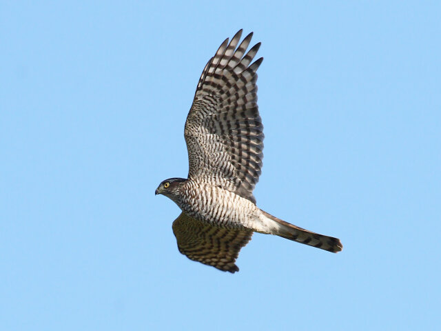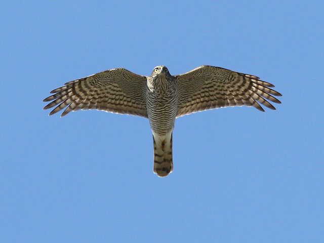Weibliche Sperber besitzen ein weißes Brustgefieder mit dunkler Querbänderung.