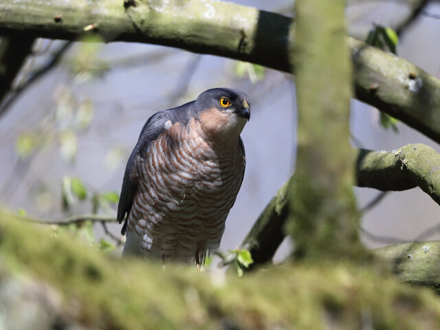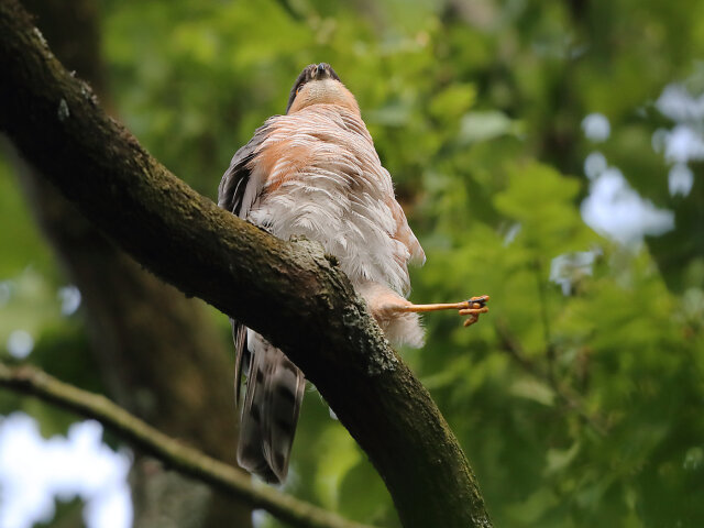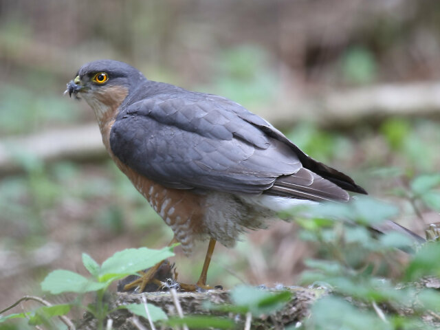 Männliche Sperber besitzen ein weißes Brustgefieder mit rostroter Querbänderung und rostroten Flanken.