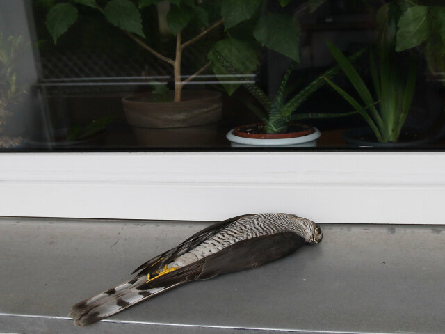 Eine weitere schwerwiegende Gefahr für den Sperber sind Kollisionen mit spiegelnden Oberflächen. Der Aufprall an Glasfassaden wie Fensterscheiben, verglaste Schallschutzwände kostet jährlich zahlreichen Sperbern das Leben.