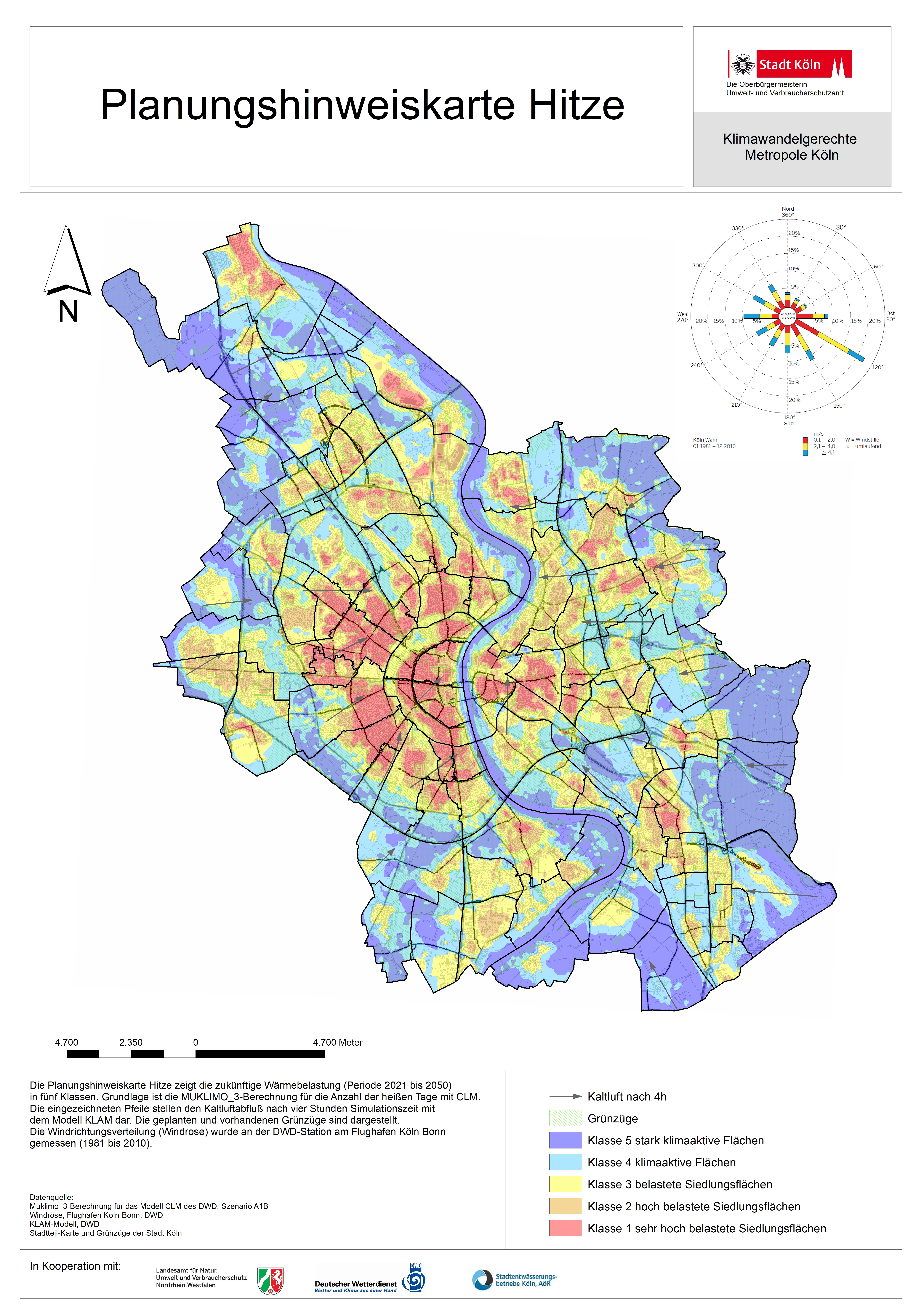 Im Rahmen der Studie wurde die Planungshinweiskarte Hitze erstellt. Dieser Karte kann entnommen werden, welche Bereiche in Köln besonders klimarelevant und daher von dichter Bebauung freigehalten beziehungsweise durch eine klimaangepasste Bebauung möglichst wenig beeinträchtigt werden sollen. Die Planungshinweiskarte ist eine synthetische Klimaanalysekarte auf Basis der Muklimo_3 Berechnungen, die die zukünftig zu erwartenden lokalklimatischen Gegebenheiten auf dem Gebiet der Stadt Köln als flächenhafte Übersicht darstellt. Die Ausweisung der klimatisch aktiven Flächen ist nicht parzellenscharf und es bedarf bei großmaßstäbigen Planungen (beispielsweise Bebauungsplänen) einer zusätzlichen Auswertung der Grundlagendaten auf Detailebene.