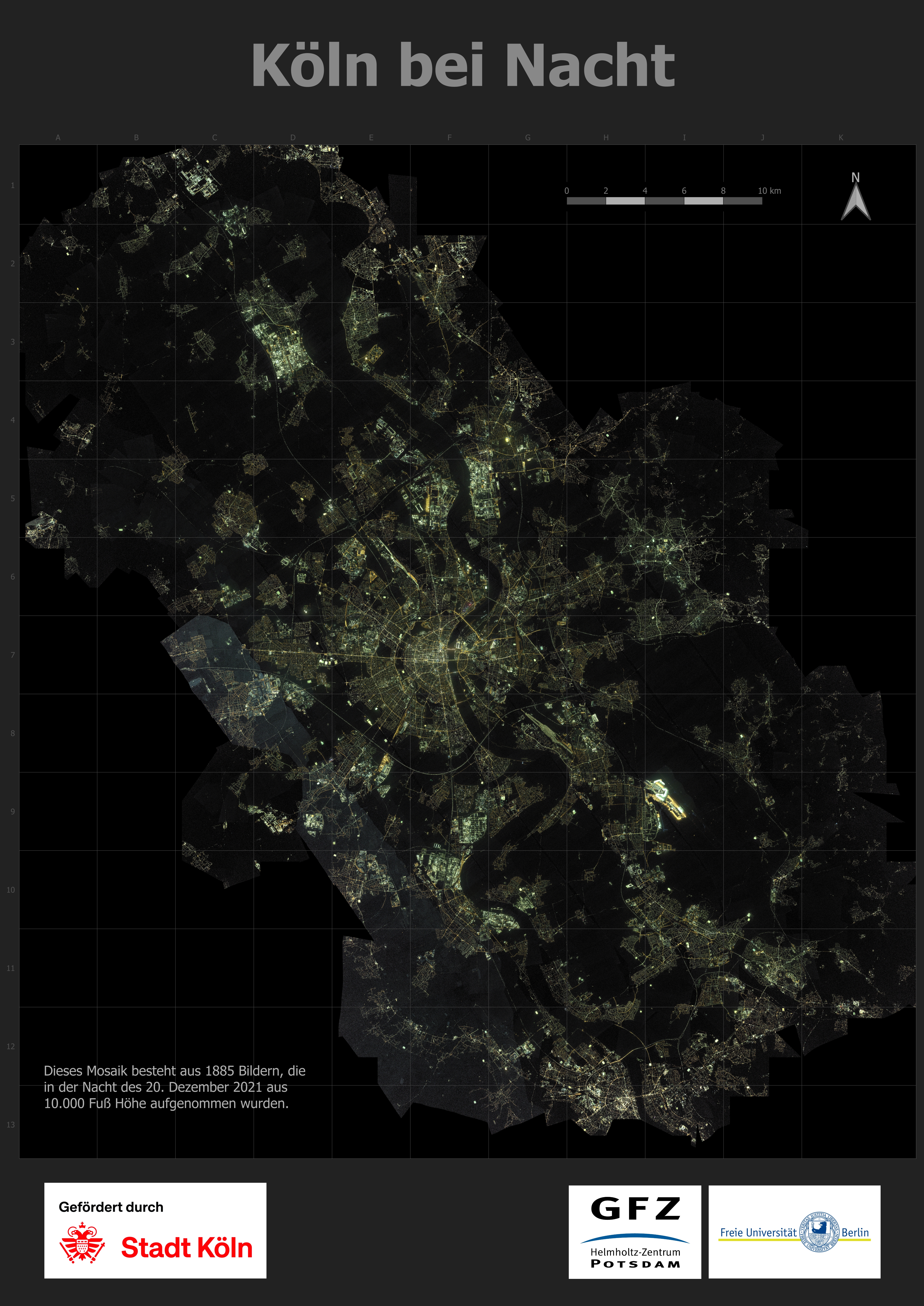 Um der Lichtverschmutzung entgegenzuwirken, werden, auch in Erwartung der neuen gesetzlichen Regelungen, stadtweite Maßnahmen erarbeitet. Hierzu war es im ersten Schritt notwendig, eine belastbare Datengrundlage zu schaffen. Das Umweltamt hat daher das Projekt CALEC (Characterization of Artificial Light Emissions of Cologne) zur Untersuchung des Istzustandes der nächtlichen Lichtemissionen im Raum Köln gefördert. Projektpartner waren das Geoforschungszentrum Potsdam sowie die Freie Universität Berlin. Im Projekt wurden am Abend des 20. Dezember 2021 Luftbilder der Stadt Köln und der Umgebung aufgenommen. Dabei wurden viele tausend Bilder in verschiedenen Lichtbereichen aufgenommen. Diese wurden anschließend zu einem Gesamtbild zusammengefügt. Die entstandenen Mosaike können in Geografischen Informationssystemen (GIS) eingelesen und ausgewertet werden. So können zum Beispiel sehr helle Lichtquellen oder Quellen mit einem hohen UV-Anteil identifiziert werden. Auch Rückschlüsse auf die verwendeten Leuchtmittel sind möglich.