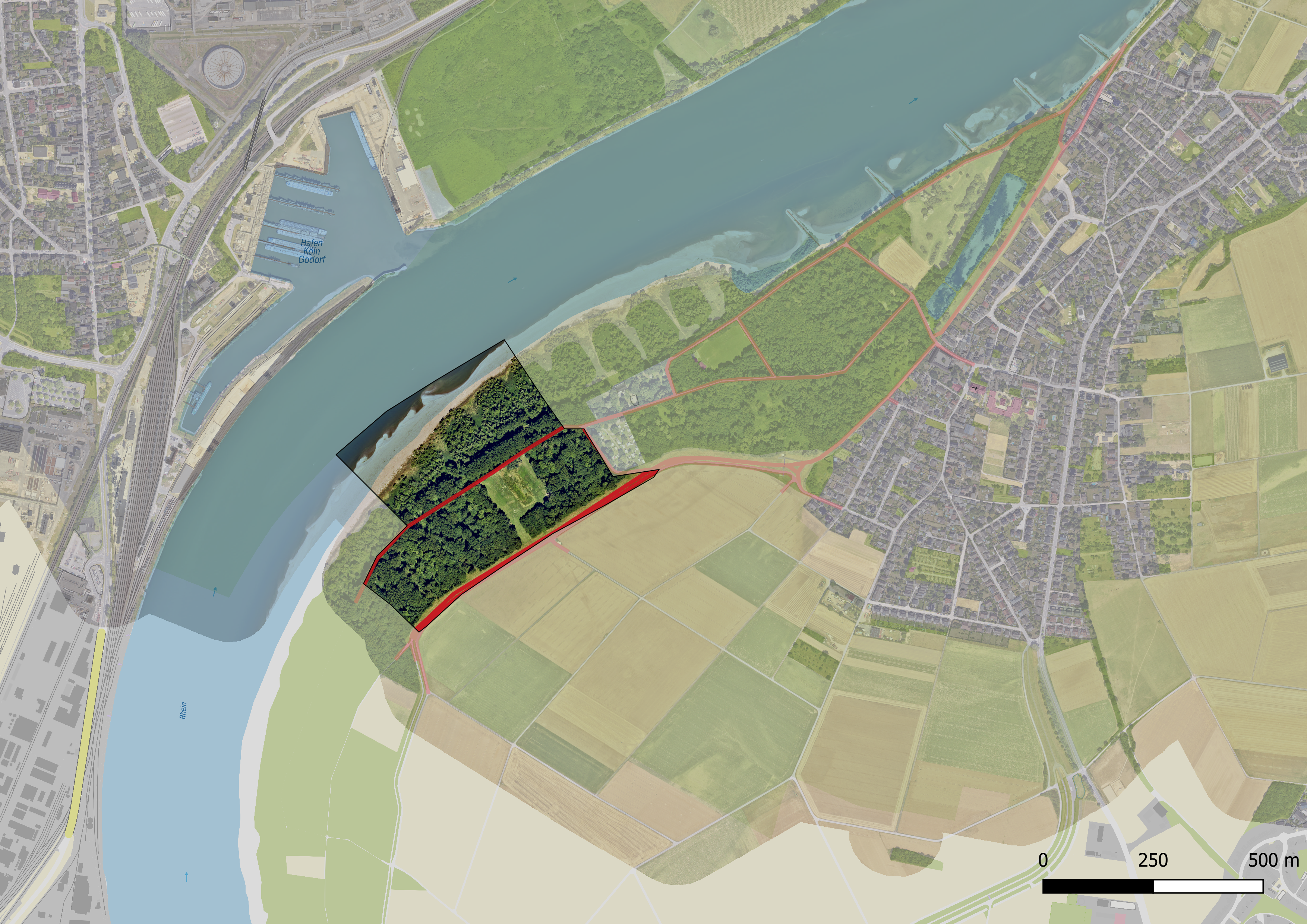 Das rund 23 Hektar große Naturschutzgebiet umfasst einen Teilabschnitt der noch unverbauten Flussaue zwischen Langel und Niederkassel. Aufgrund des hier sehr flach ansteigenden Geländes (Gleithang) in Verbindung mit einer natürlichen Substratdiversität ist hier ein äußerst wertvolles Mosaik natürlicher Ufergesellschaften entstanden, das von den einjährigen Pioniergesellschaften (Flussmelden-Gesellschaften) über ein Mosaik aus Flutrasengesellschaften, Schlankseggenried und Rohrglanzgrasröhricht sowie weiter landeinwärts in die Weichholzaue mit Korbweiden-/Mandelweidengebüsch und Silberweidenauenwälder und Alt-Pappelwälder, die bereits in der Zone der Hartholzaue liegen, übergeht.