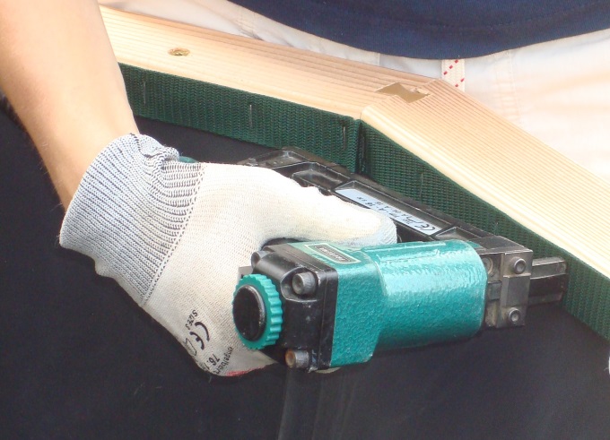 Befestigen Sie die Folie am oberen Rand des Hochbeetes bündig abschließend zunächst mit Edelstahl-Tackern und tackern Sie über den Rand ebenfalls bündig ein Gurtband über die Folie an das Holz.