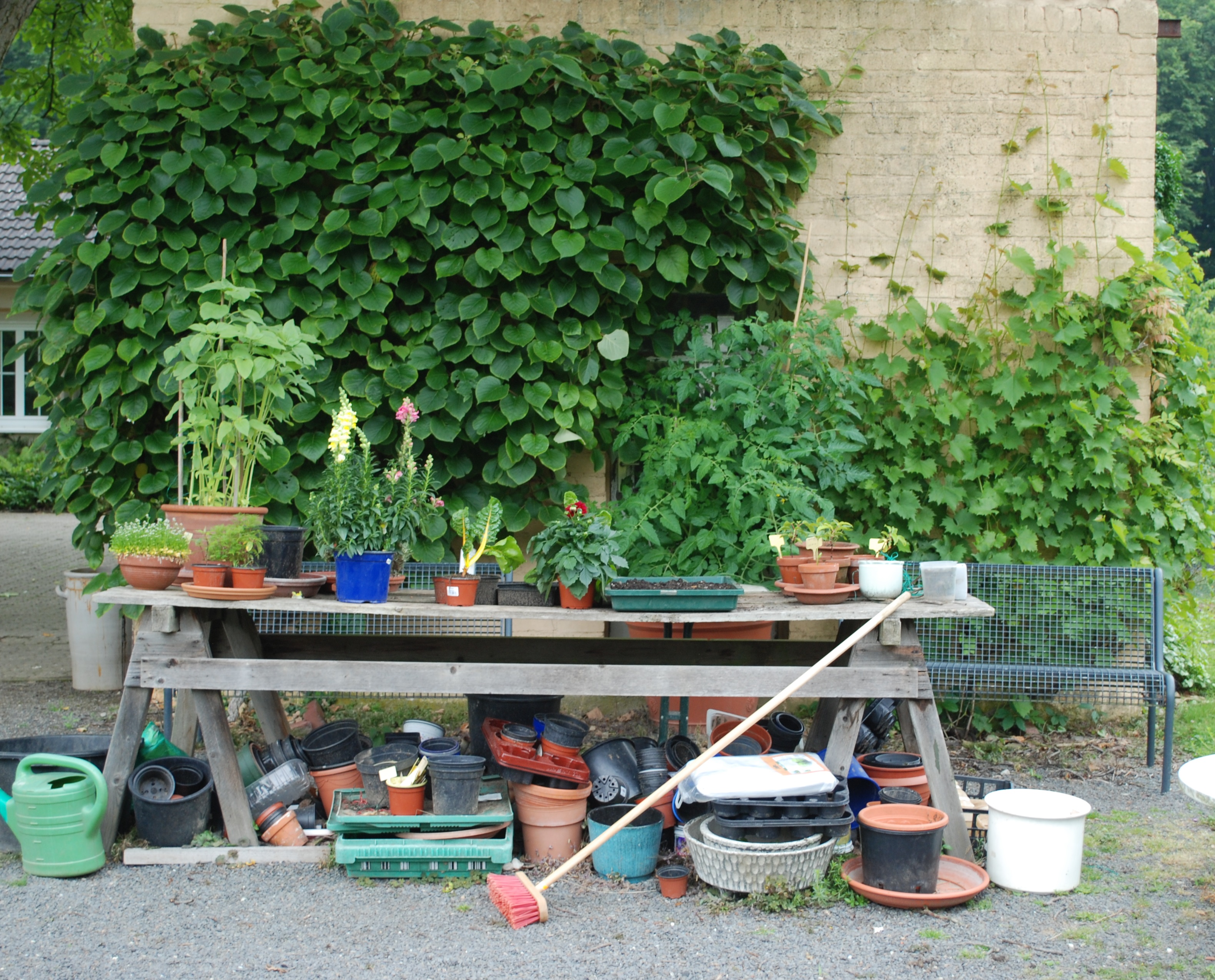 Dafür ist es sinnvoll, in einer Ecke, die sich für den Anbau von Pflanzen nicht eignet (Schatten, schlechter oder versiegelter Boden), eine Fläche als Materiallager und Arbeitsfläche einzuplanen.
