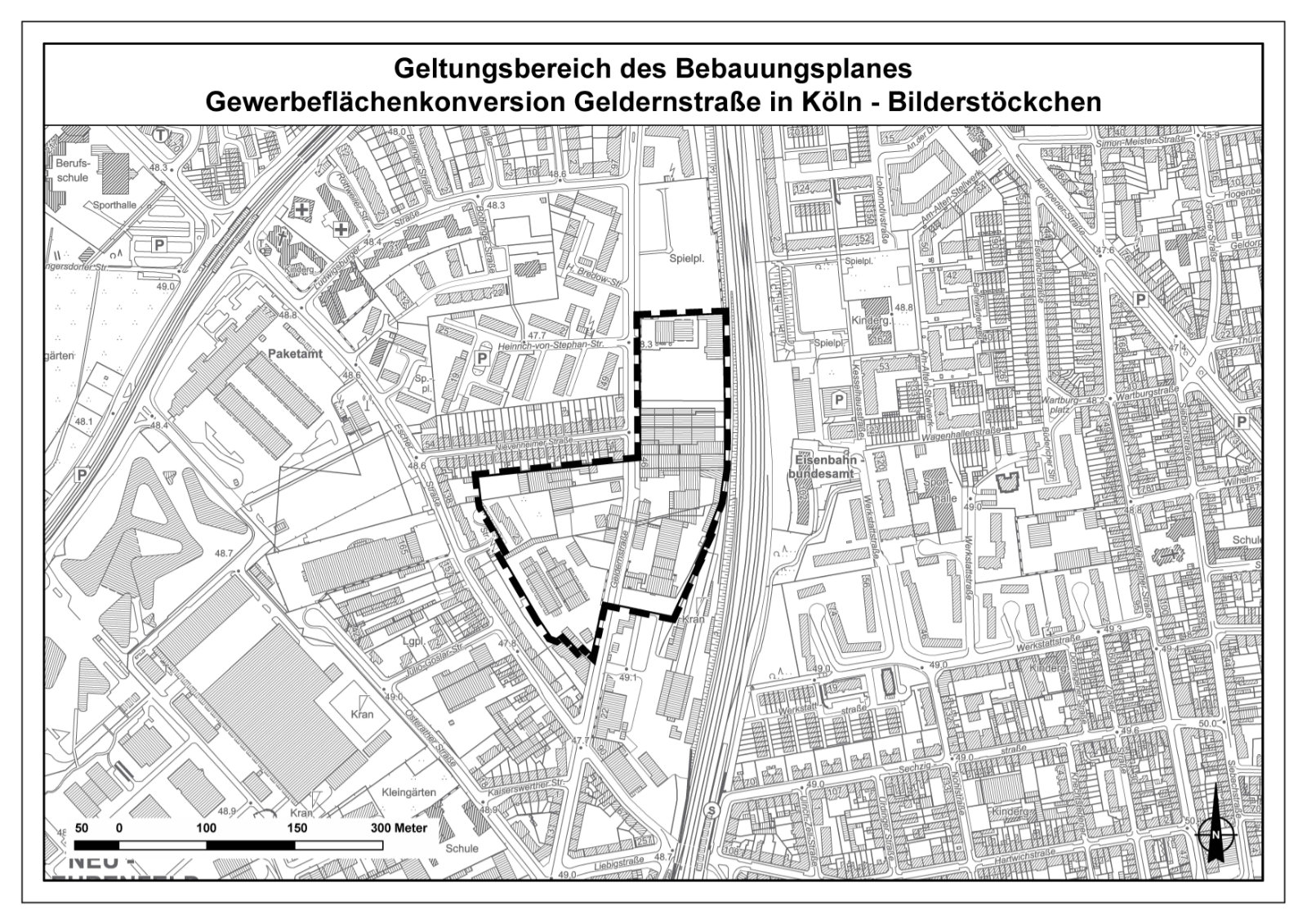 Der Stadtentwicklungsausschuss hat am 27. März 2025 unter anderem beschlossen, nach § 2 Absatz 1 Baugesetzbuch (BauGB) einen Bebauungsplan für das Gebiet östlich der Wohnbebauung Geldernstraße 96-144, südlich der Wohnbebauung Nievenheimer Straße 1-51, westlich der Geldernstraße auf Höhe der Hausnummern 15-43 sowie für das Grundstück Geldernstraße 46 (ehemaliges Firmengelände von Tuffi-Campina) – Arbeitstitel: Gewerbeflächenkonversion Geldernstraße in Köln-Bilderstöckchen aufzustellen mit dem Ziel,