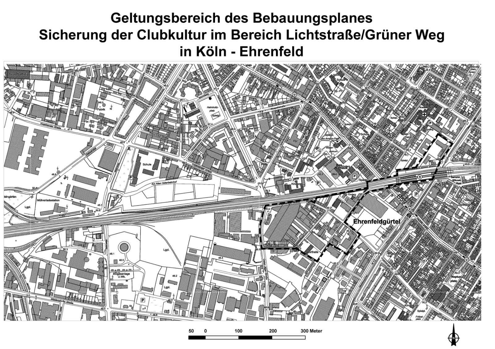 Der Ausschuss für Stadtentwicklung und regionale Zusammenarbeit hat in seiner Sitzung am 5. Dezember 2024 unter anderem beschlossen, den Plangeltungsbereich des am 1. Juni 2023 gefassten und am 23. August 2023 im Amtsblatt bekannt gemachten Aufstellungsbeschluss des Bebauungsplanes – Arbeitstitel: Sicherung der Clubkultur im Bereich Lichtstraße/Grüner Weg in Köln-Ehrenfeld – um die Gebiete südlich des Clubs "Sonic Ballroom", westlich und östlich der Schönsteinstraße sowie nördlich des Clubs "artheater" zu erweitern und den Arbeitstitel zu ändern in "Sicherung der Clubkultur im Bereich Lichtstraße/Ehrenfeldgürtel" in Köln-Ehrenfeld.