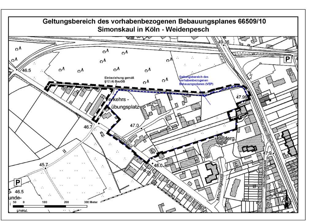 Öffentliche Auslegung nach § 3 Absatz 2 Baugesetzbuch des Bebauungsplan-Entwurfs (vorhabenbezogener Bebauungsplan) Nummer 66509/10 mit gestalterischen Festsetzungen für eine Fläche im Bereich Simonskaul – Neusser Straße in Köln-Weidenpesch Arbeitstitel: Simonskaul in Köln-Weidenpesch