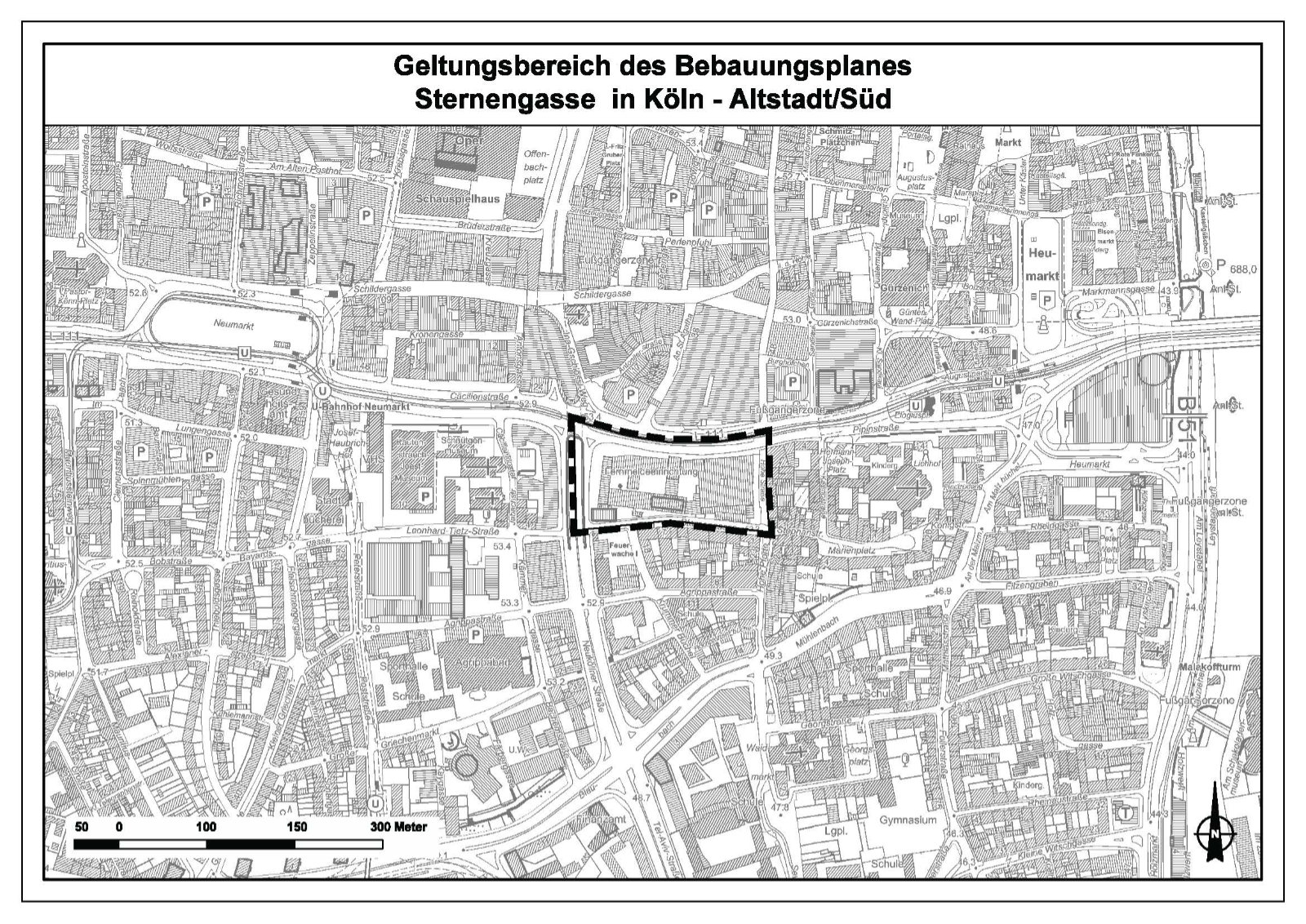 Der Stadtentwicklungsausschuss hat in seiner Sitzung am 26. Juni 2025 unter anderem beschlossen, nach § 2 Absatz 1 Baugesetzbuch (BauGB) in Anwendung des vereinfachten Verfahrens nach § 13 BauGB einen Bebauungsplan für das Gebiet westlich der Hohe Straße, nördlich der Sternengasse, östlich der Neuköllner Straße und südlich der Cäcilienstraße – Arbeitstitel: Sternengasse in Köln-Altstadt/Süd – aufzustellen mit dem Ziel, Vergnügungsstätten auszuschließen, Werbeanlagen zu reglementieren und Baumstandorte zu sichern.