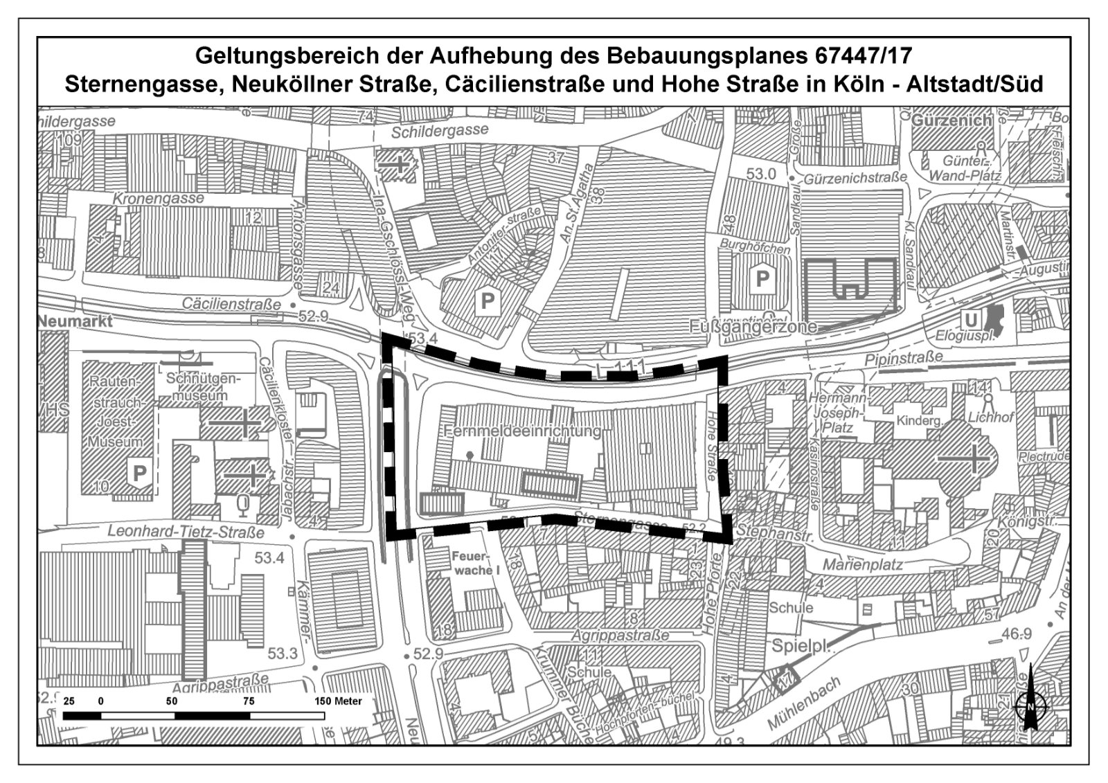 Der Stadtentwicklungsausschuss beschließt, das Verfahren zur Aufhebung des Bebauungsplanes Nr. 67447/17 für das Gebiet zwischen Cäcilienstraße, Ostgrenze Hohe Straße, Sternengasse und Nord-Süd-Fahrt — Arbeitstitel: Sternengasse, Neuköllner Straße, Cäcilienstraße und Hohe Straße in Köln-Altstadt/Süd — nach § 2 Absatz 1 in Verbindung mit § 1 Absatz 8 Baugesetzbuch (BauGB) in Anwendung des beschleunigten Verfahrens nach § 13a BauGB einzuleiten.
