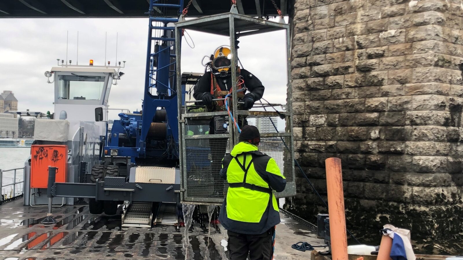 Die Senkkästen und die Brückenpfeiler der Hohenzollernbrücke erfassten wir optisch unterhalb des Wassers mit einer Tauchergruppe, die mit Helmkameras filmte. Wir bewerteten die Aufnahmen vor Ort und blieben im stetigen Austausch mit der Tauchergruppe.