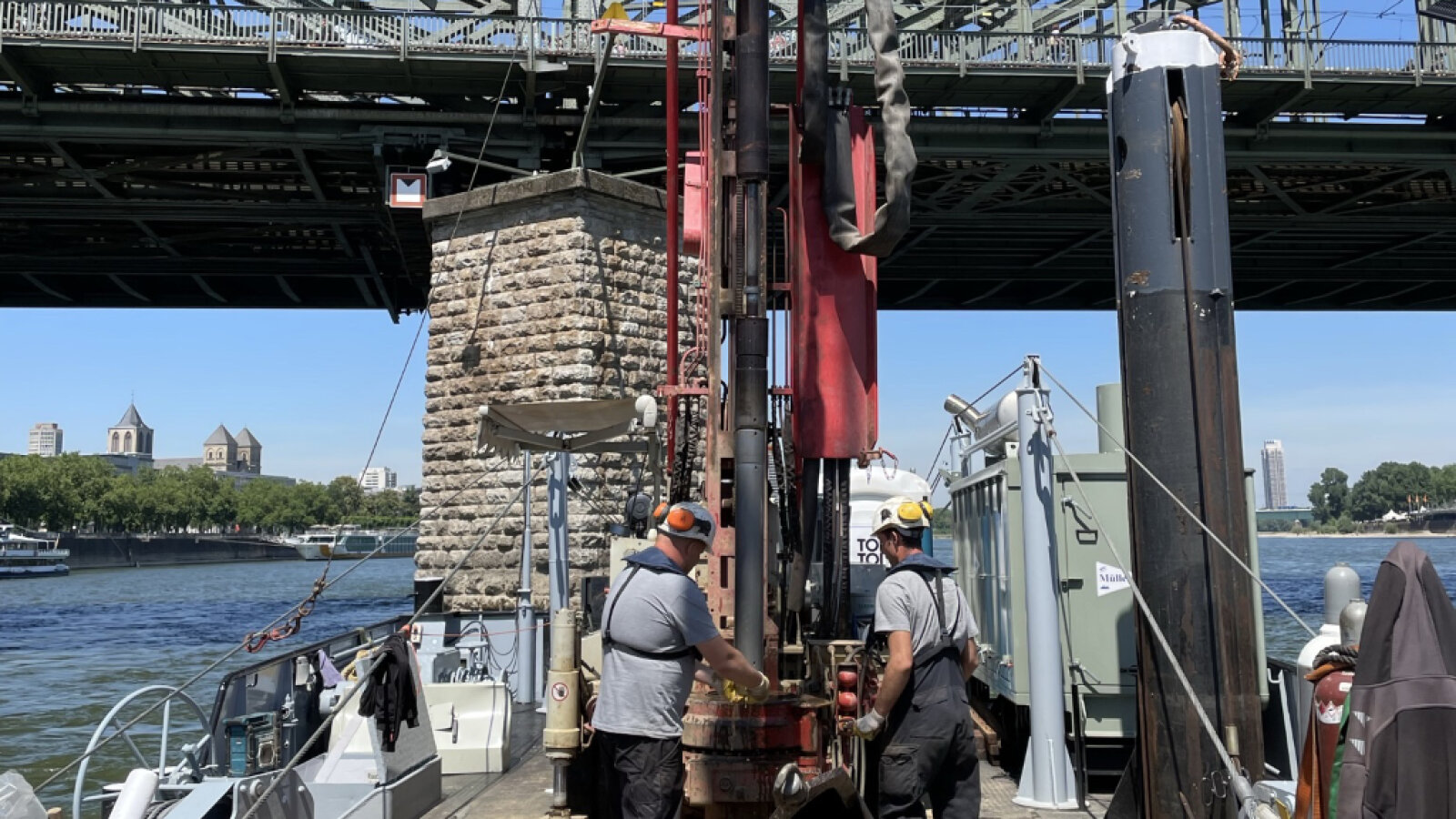 Wir führten mit Hilfe von Tauchergruppen Kernbohrungen zur Ermittlung der Beton-/Baustoffgüte an den Senkkästen und an den Überresten der Pfeiler durch. Die Kernbohrungen wurden vollständig unter Wasser ausgeführt. Die Bohrlänge beträgt circa acht Meter.