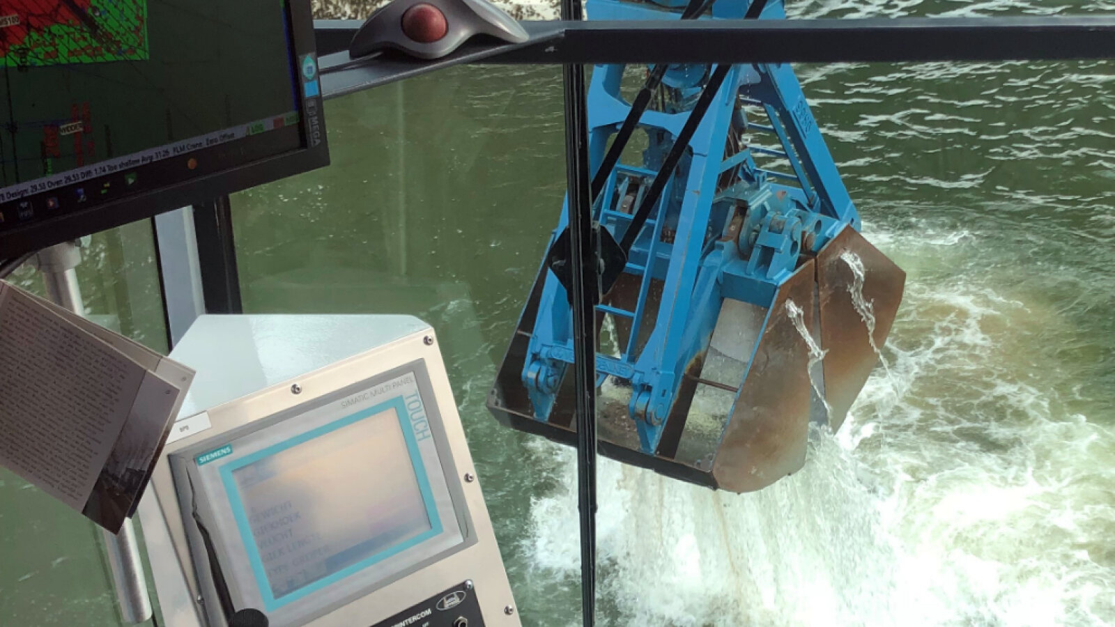 Wir führten eine Peilung mit einem Vermessungsschiff durch. Dadurch wurde ersichtlich, dass die Senkkästen vollständig und ausreichend mit dem zuvor aufgeschütteten Füllmaterial überdeckt sind. Mit dieser Peilung stellten wir sicher, dass die Senkkästen ausreichend befestigt sind.