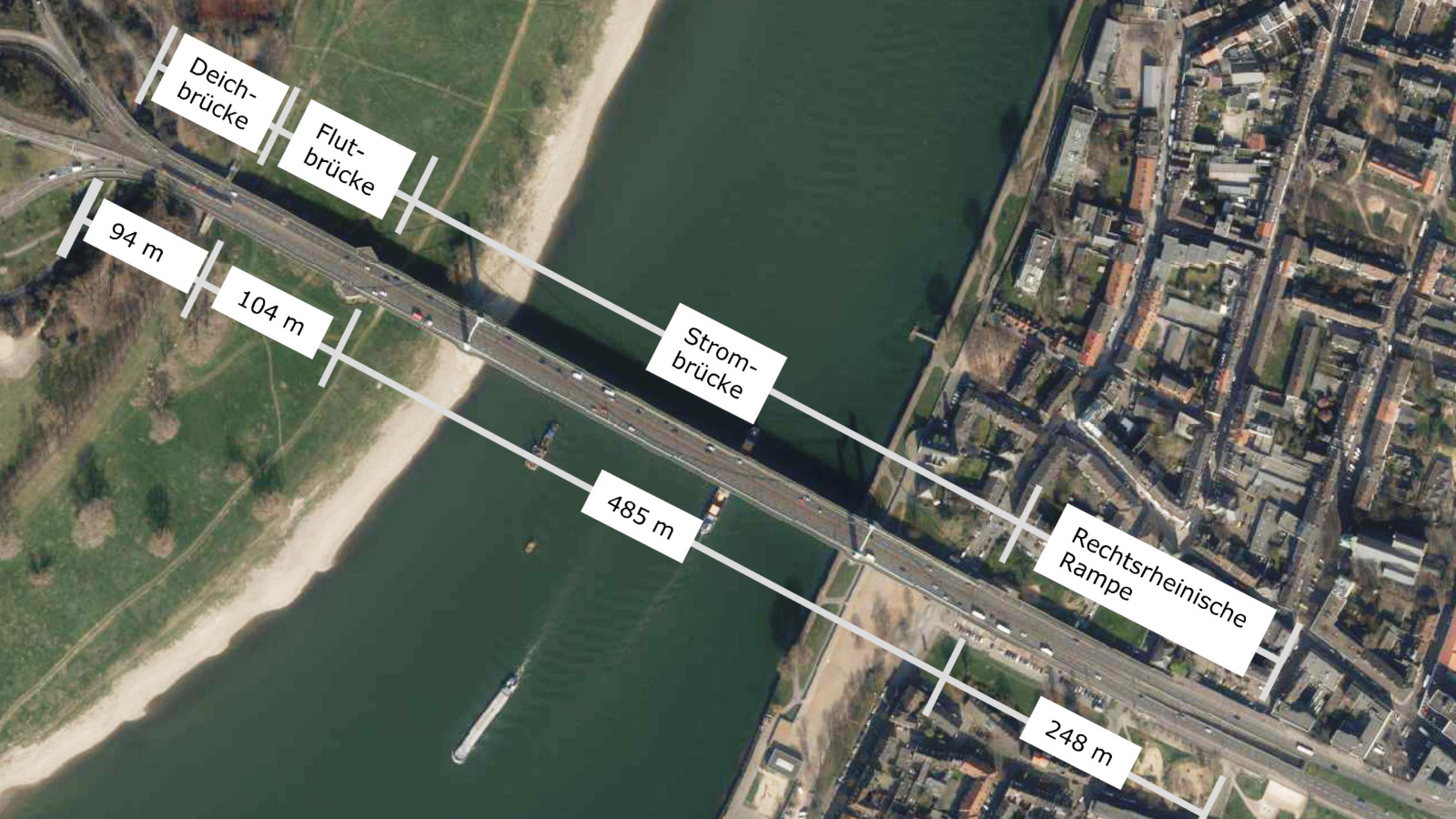 Der rund ein Kilometer lange Brückenzug besteht aus vier Teilbauwerken. Die beiden außenliegenden Bauwerke - die rechtsrheinische Rampe und linksrheinisch die Deichbrücke - werden abgebrochen und komplett erneuert. Die dazwischenliegenden Teilbauwerke Strom- und Flutbrücke werden grundhaft saniert und verstärkt.