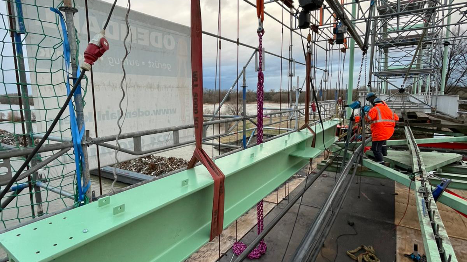 Im November 2024 haben wir mit den Arbeiten gestartet und die Brücke eingerüstet. Anschließend haben wir mit den Montagearbeiten zur Lagesicherung der Brücke bei herausgetrennten Stahlbauteilen und ersten Trennarbeiten begonnen. Die beschädigten Abhänger der Brücke haben wir demontiert und durch neue Abhänger ausgetauscht.