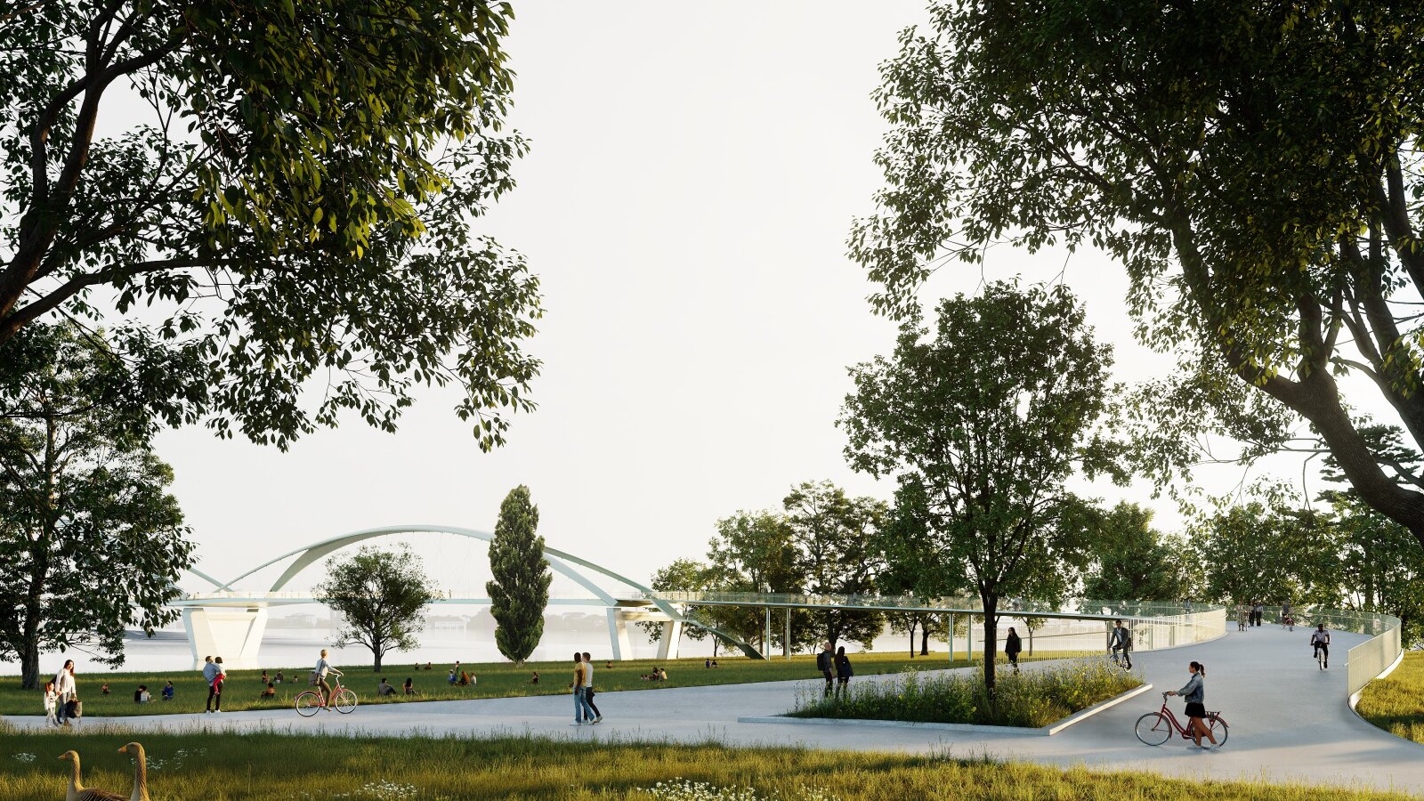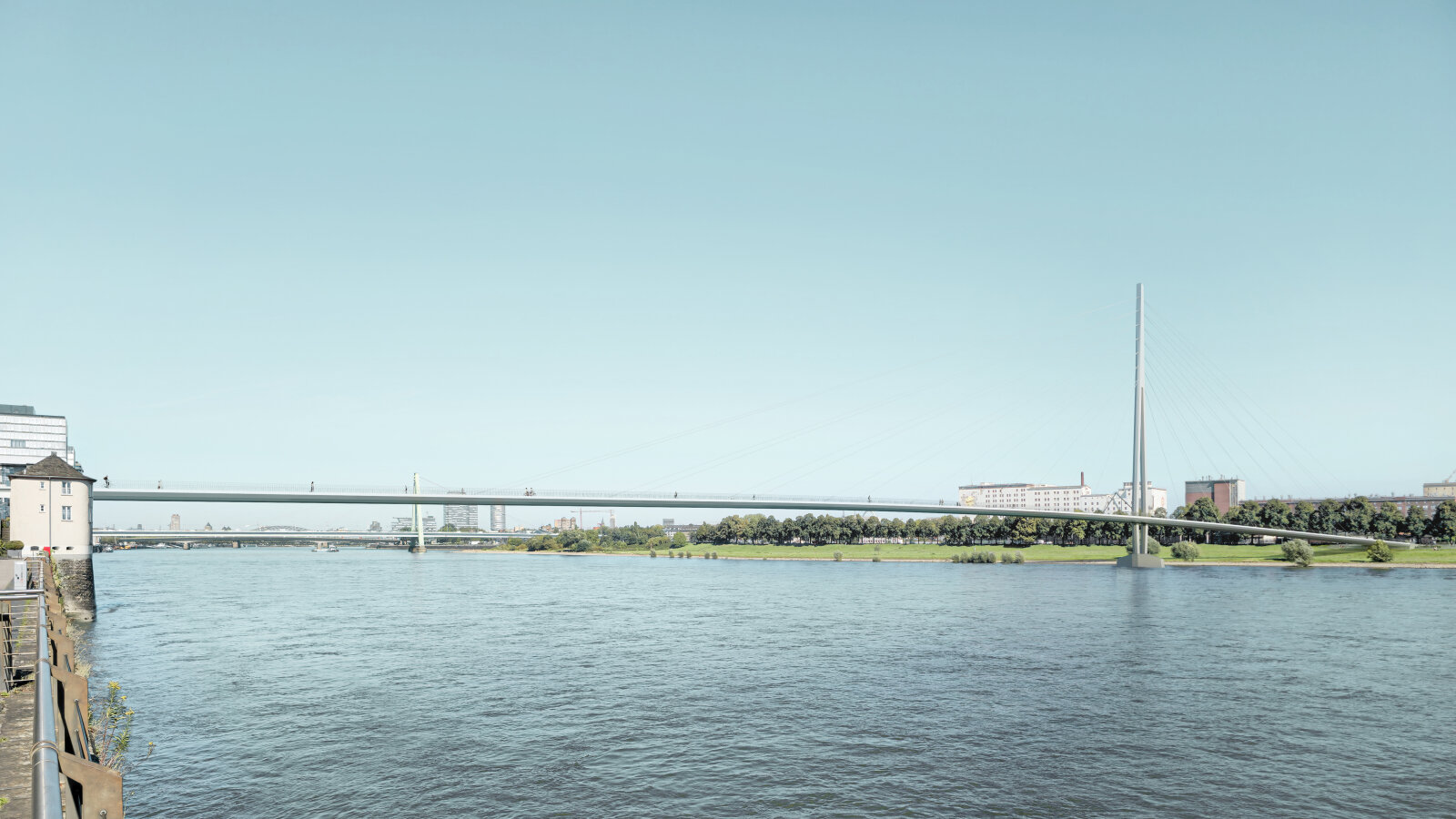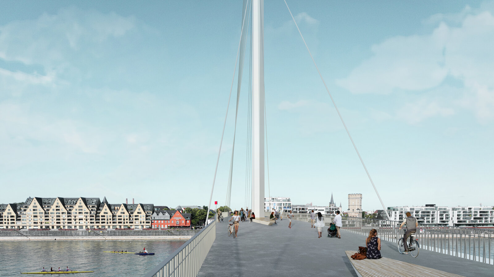 Der Entwurf sieht Bereiche auf der Brücke vor, die zum Verweilen einladen. Die Menschen können von hier den Ausblick auf die Stadt und das Rheinpanorama genießen.