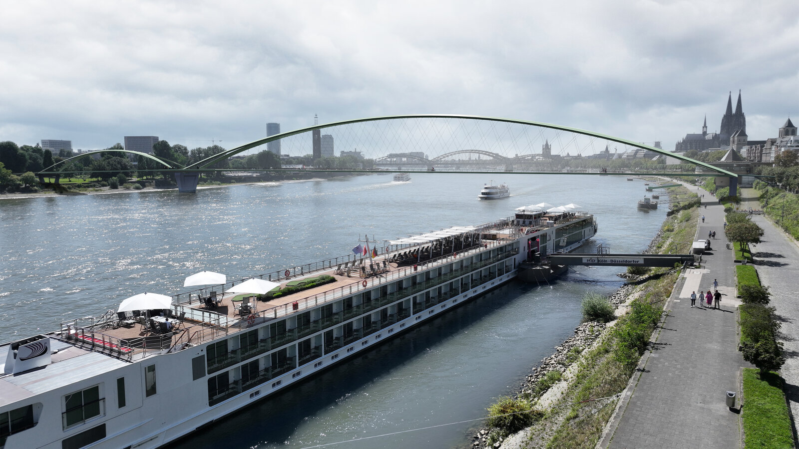 Am Ubierring erhebt sich das Bauwerk mit einer schlanken Rampenanlage und verläuft parallel zur Baumallee Richtung Rheinbastion. Die Nutzung des Elisabeth-Treskow-Platzes wird durch die neue Brücke nicht beeinträchtigt. Die Rampen stehen auf schlanken Stützen, damit die Sicht im Park am Ubierring und auf den Rhein so wenig wie möglich gestört wird. Auf der rechten Rheinseite spannt sich die Brücke stützenfrei über die geschützten Poller Wiesen und endet kurz vor der bestehenden Baumallee.