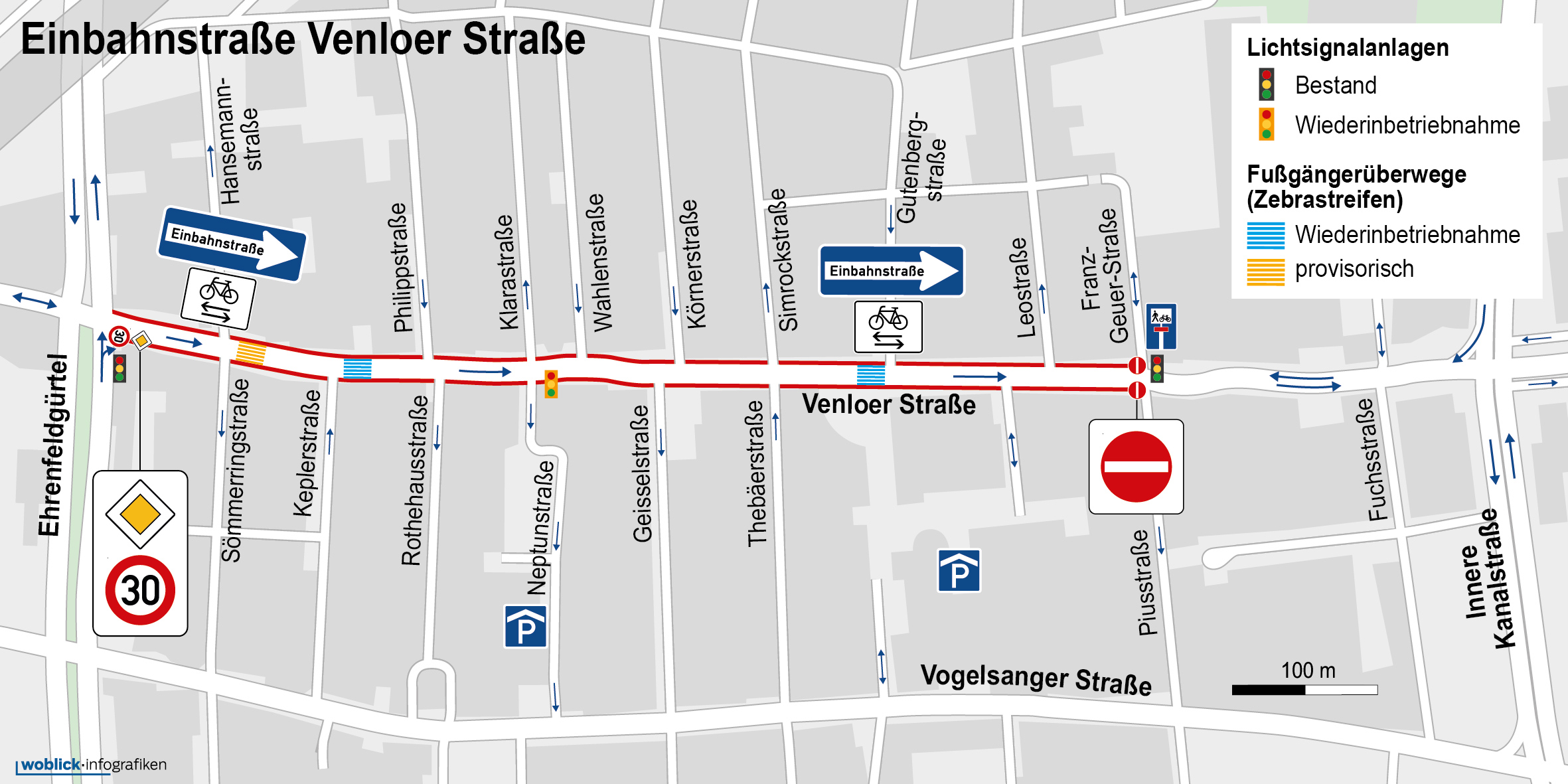 Die Venloer Straße ist seit 23. Oktober 2023 zwischen Ehrenfeldgürtel und Piusstraße eine Einbahnstraße. Sie verläuft in Fahrtrichtung Innenstadt. Die Einbahnstraße endet auf Höhe der Piusstraße/Franz-Geuer-Straße, damit wir die Erreichbarkeit zentraler Ziele wie die Zentralmoschee, einen Supermarkt und eine Tankstelle aus beiden Fahrtrichtungen gewährleisten können.