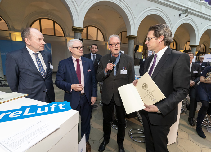 Förderbescheidübergabe am 19. Dezember 2019 im Bundesverkehrsministerium - Von links nach rechts: Jörn Schwarze (KVB), Karsten Möring (MdB), Hartmut Sorich (Stadt Köln), Andreas Scheuer (Bundesverkehrsminister)