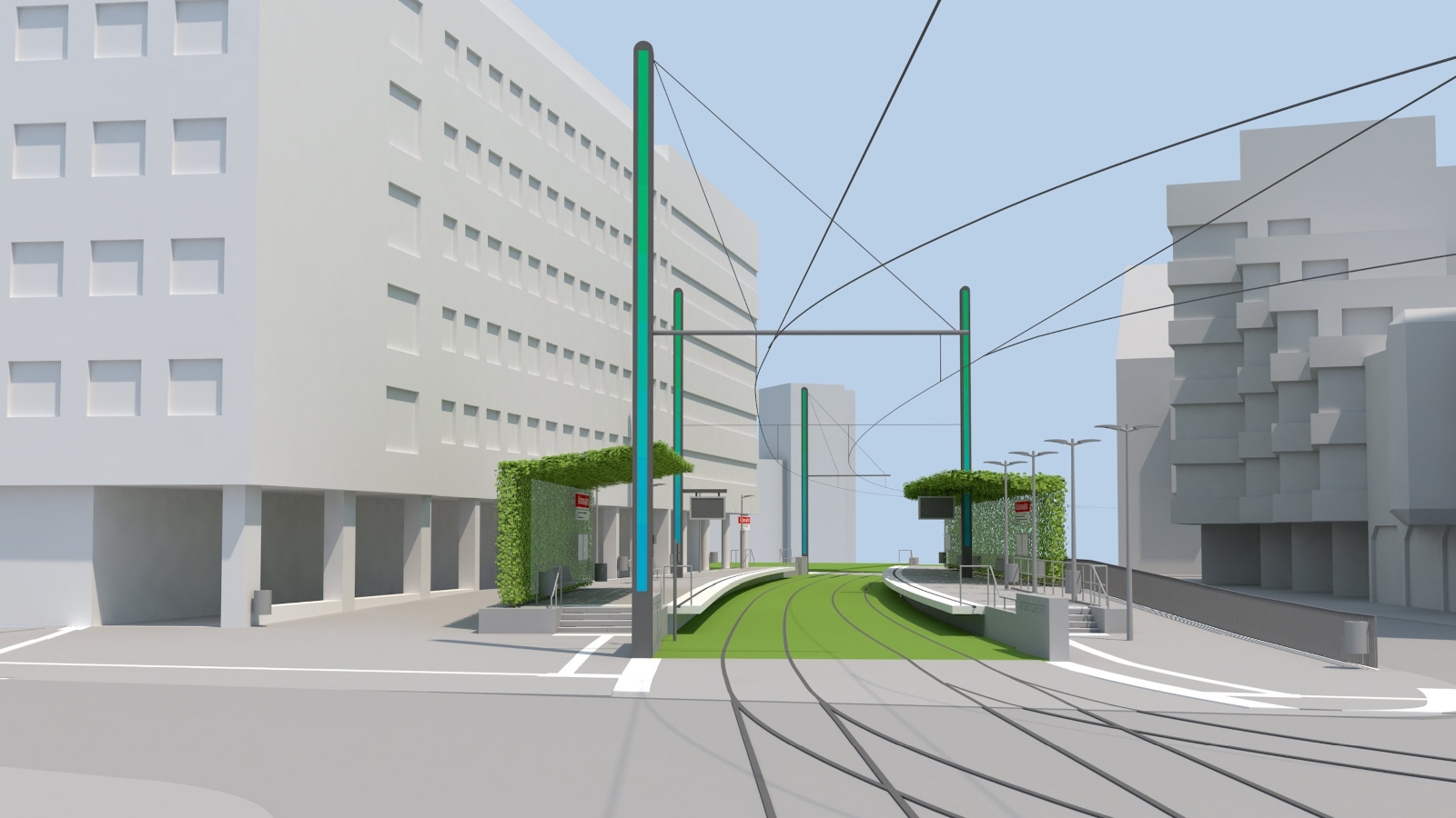 Für den barrierefreien Umbau der Haltestelle werden wir die Stadtbahntrasse im Haltestellenbereich um circa 30 Zentimeter absenken. Dies ermöglicht Ihnen das komfortable Erreichen der Bahnsteige über Gehwege und kürzere Treppen. Am Übergang zu den Arkaden wird es zwei Stufen geben, um den Höhenunterschied auszugleichen. Um den Aufenthalt an der Haltestelle angenehm zu gestalten, werden wir vier Sitzbänke im Bereich der Arkaden aufstellen. Den barrierefreien Zugang planen wir bei beiden Bahnsteigen auf der Westseite. Die Bahnsteige werden wir mit taktilen Leitelementen ausstatten. Außerdem soll das Fahrgastinformationssystem über akustische Ansagen verfügen, die auch Menschen mit Sehbehinderung die Informationen zugänglich machen.
