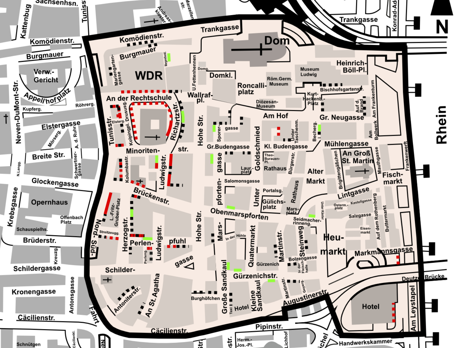 Im Gebiet innerhalb der Cäcilienstraße, der Augustinerstraße, Am Leystapel, der Trankgasse, der Komödienstraße und der Tunisstraße können Sie mit dem Bewohnerparkausweis "CITY" auf Parkplätzen mit Parkscheinautomaten mit dem "roten Punkt" gebührenfrei parken.