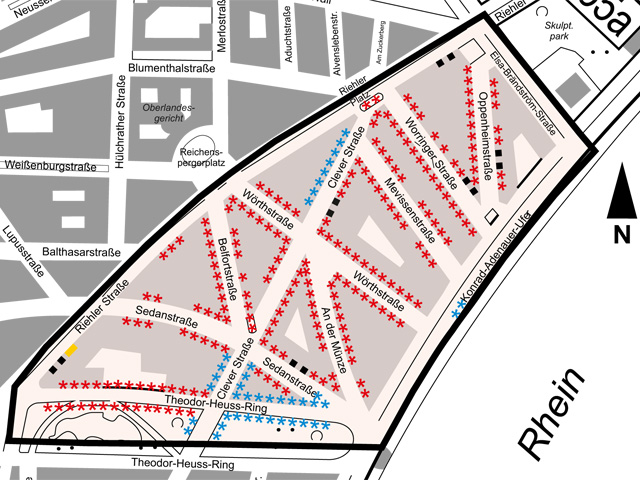 Im Gebiet innerhalb des Theodor-Heuss-Rings, des Konrad-Adenauer-Ufers, der Elsa-Brandström-Straße, des Riehler Platzes und der Riehler Straße können Sie mit dem Bewohnerparkausweis "NORD" auf Parkplätzen mit Parkscheinautomaten mit dem "roten Punkt" gebührenfrei parken. Ausnahmen sind Parkplätze mit Parkscheinautomaten ohne den "roten Punkt".