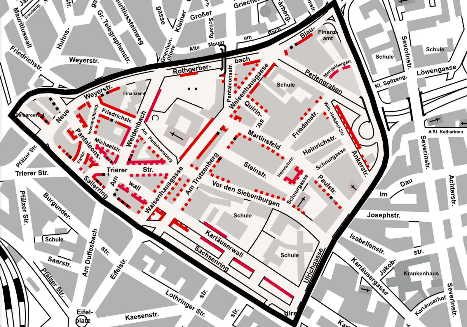 Im Gebiet innerhalb des Barbarossaplatzes, des Salierrings, des Sachsenrings, der Ulrichgasse, der Tel-Aviv-Straße, des Blaubachs, des Rothgerberbachs, der Neuen Weyerstraße und Am Weidenbach können Sie mit dem Bewohnerparkausweis "PAN" auf Parkplätzen mit Parkscheinautomaten mit dem "roten Punkt" gebührenfrei parken. Ausnahmen sind Parkplätze mit Parkscheinautomaten ohne den "roten Punkt".