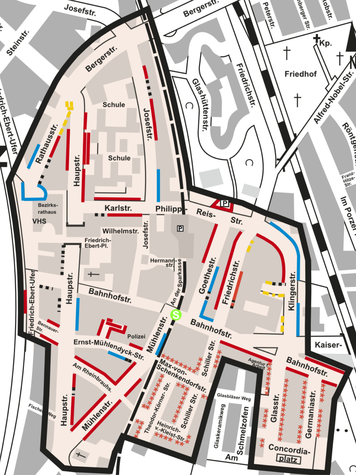Im Gebiet einschließlich der Bergerstraße, der Rathausstraße, des Friedrich-Ebert-Ufers, der Bennauerstraße, der Hauptstraße, der Mühlenstraße, der Heinrich-von-Kleist-Straße, der Schillerstraße, der Bahnhofstraße, der Glasstraße, des Concordiaplatzes, der Klingerstraße, der Philipp-Reis-Straße und der Josefstraße können Sie mit dem Bewohnerparkausweis "Porz" auf Parkplätzen mit Parkscheinautomaten mit dem "roten Punkt" gebührenfrei parken. Ausnahmen sind Parkplätze mit Parkscheinautomaten ohne den "roten Punkt".