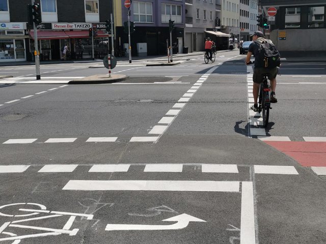 Wir haben seitdem die Follerstraße für Radfahrende zwischen Georgstraße und Kleine Witschgasse geöffnet. Als nächstes haben wir die Mathiasstraße für Radfahrende geöffnet. Das war nur durch eine Erneuerung der Ampeln möglich. Auf dem ehemaligen Parkplatz haben wir eine Aufstellfläche für den querenden Radverkehr erstellt. Auch für Radfahrende, die in Einbahnstraßenrichtung unterwegs sind, haben wir die Ausfahrt aus der Mathiasstraße auf den Mühlenbach verbessert. Eine vorgezogene Haltelinie bietet Radfahrenden eine Fläche zum Aufstellen in erster Reihe.