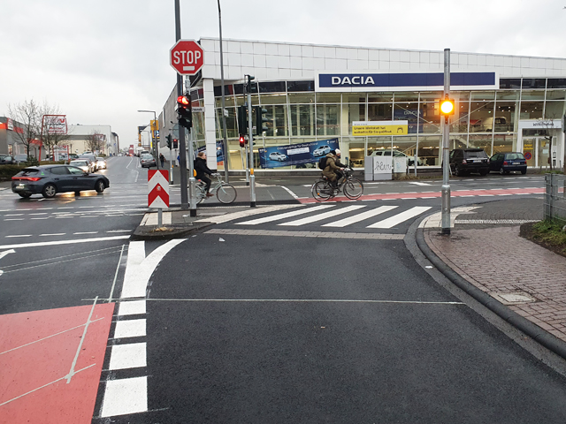 Auch wurde die Kreuzung insgesamt fahrradfreundlich umgestaltet. Neben Markierungen für den Radverkehr, wie etwa Roteinfärbungen oder vorgezogene Aufstellflächen, wurden zwei indirekte Linksabbieger installiert.