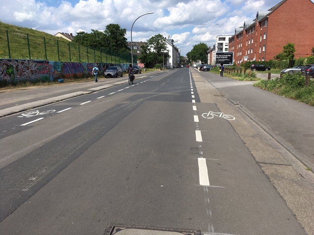Anfang Mai haben wir auf der Kalk-Mülheimer Straße 1,75 Meter breite Schutzstreifen zwischen der Istanbulstraße und der Heidelberger Straße auf die Fahrbahn markiert. Mit der Markierung der Schutzstreifen wird dem Radverkehr mehr Platz eingeräumt und eine bessere Übersicht für alle Verkehrsteilnehmenden erreicht. Damit ein ausreichender Sicherheitsabstand zu den Stellplätzen auf der Nebenanlage gewährleistet werden kann, wurden alle Stellplätze um 75 Zentimeter von der Fahrbahn versetzt. Die Maßnahme umfasst insgesamt gut 350 Meter.