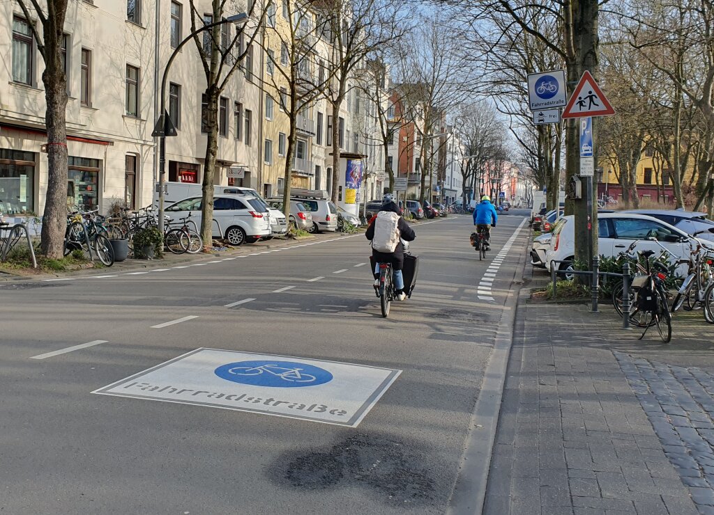 Auf der Fahrradstraße Weyertal haben wir erstmalig einen Sicherheitstrennstreifen zum Parken markiert. Auf dem etwa 100 Meter langen Abschnitt zwischen Palanterstraße und Nikolausstraße erproben wir die neue Markierung. Zur Verdeutlichung der Fahrradstraße haben wir vier weitere Fahrradstraßenpiktogramme aufgebracht.