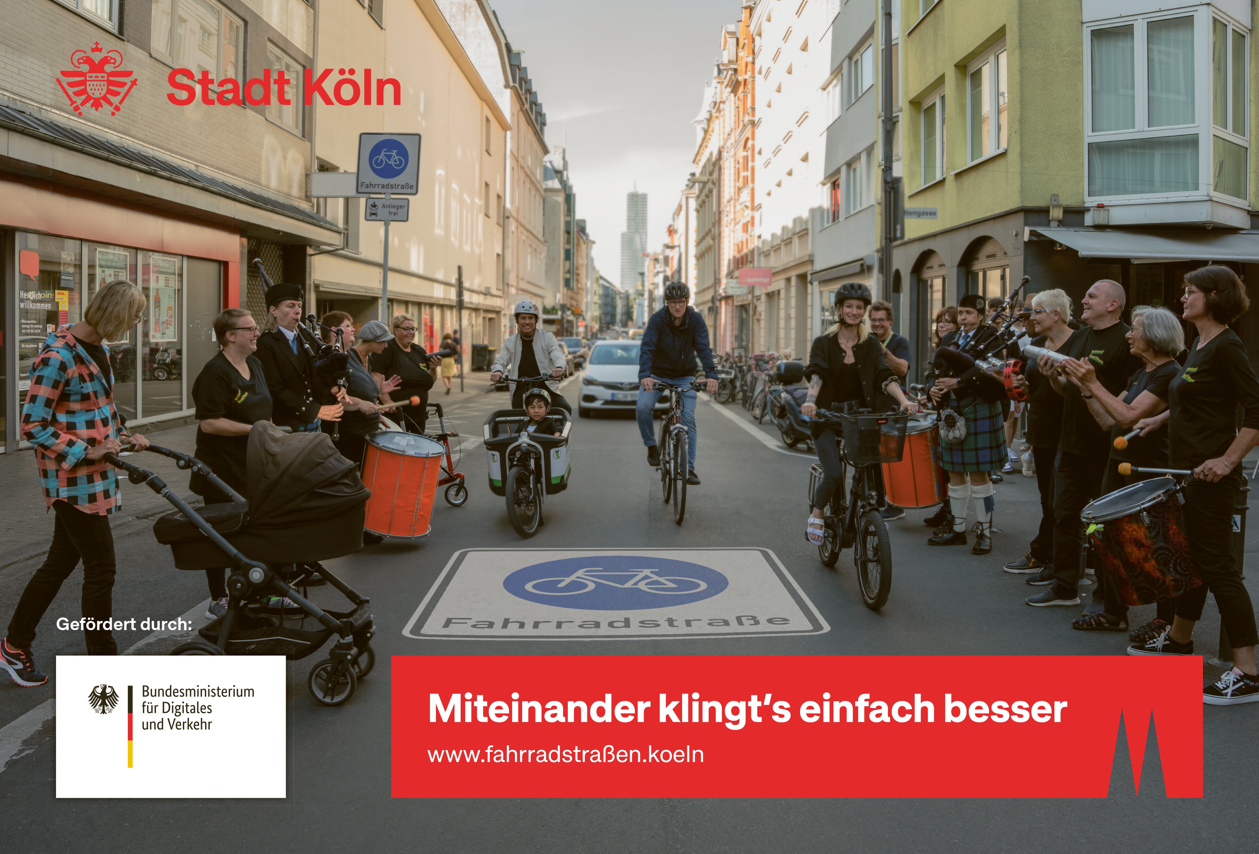 Um dieses Miteinander geht es in der zweiten Welle unserer Kampagne. Musikalisch trifft in der Fahrradstraße nun eine Gruppe Sambistas auf eine Dudelsack-Formation, zwei vollkommen gegensätzliche Musikrichtungen. Dennoch spielen alle im Einklang, eben miteinander, ein gemeinsames Stück.