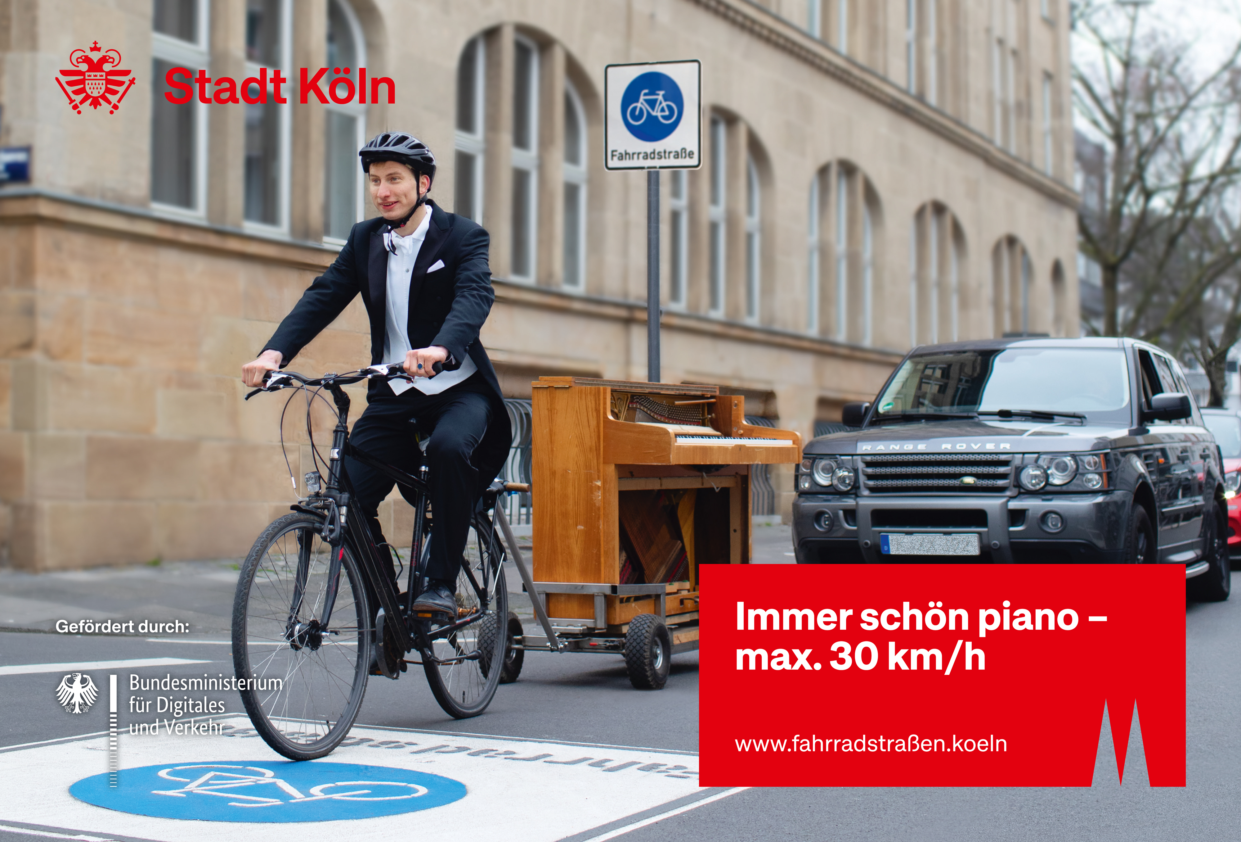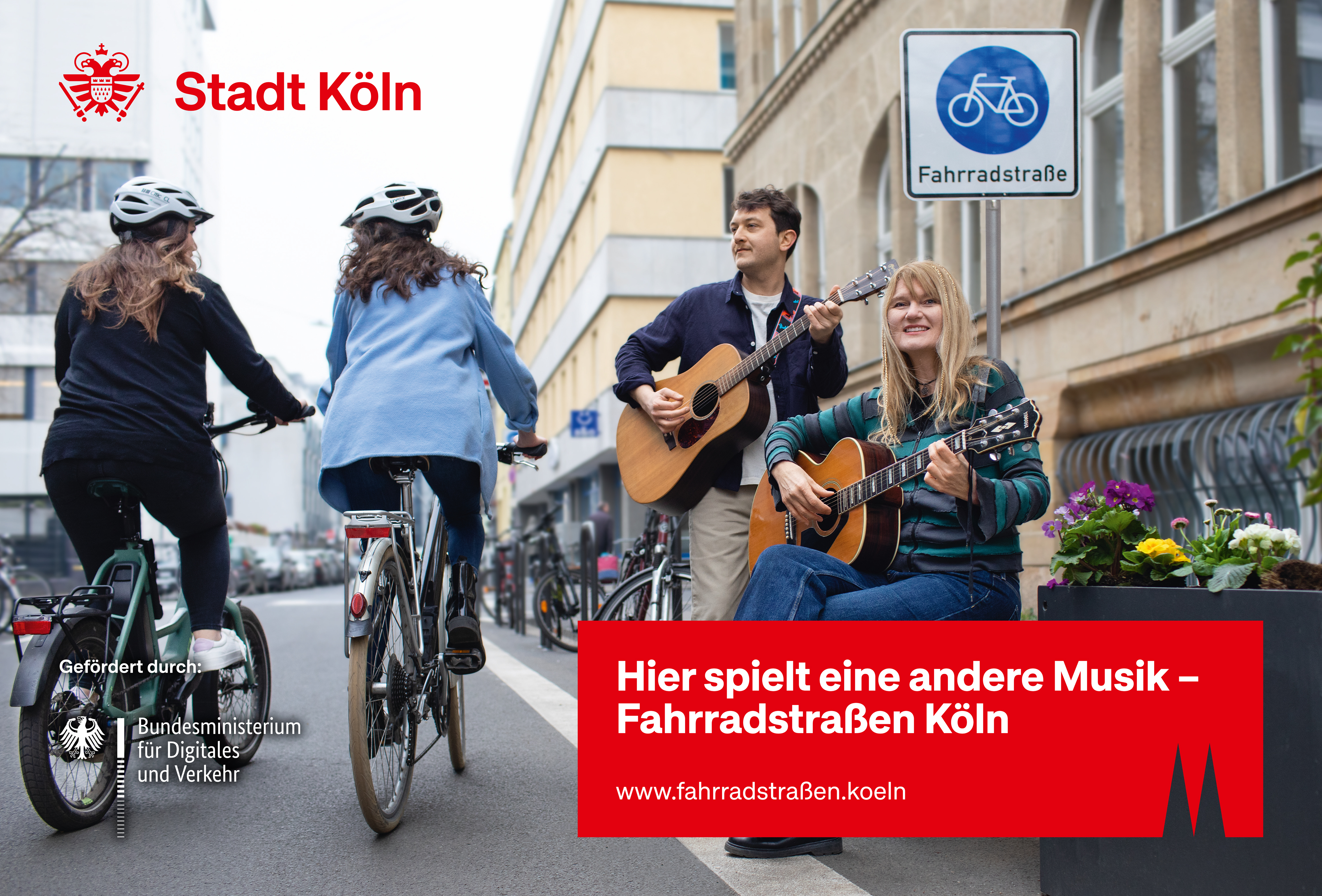 Um die Regeln, die in einer Fahrradstraße gelten, zu erklären haben wir die Kampagne "Hier spielt eine andere Musik" ins Leben gerufen. Damit möchten wir erreichen, dass alle Verkehrsteilnehmenden die Regeln kennen und das Miteinander aller Mobilitätsarten in der Fahrradstraße entspannt erleben können. Das Besondere: Die Regeln werden von Kölner*innen, die gleichzeitig leidenschaftliche Musiker*innen- und Radfahrer*innen sind, mit Assoziationen aus der Musikwelt erklärt.