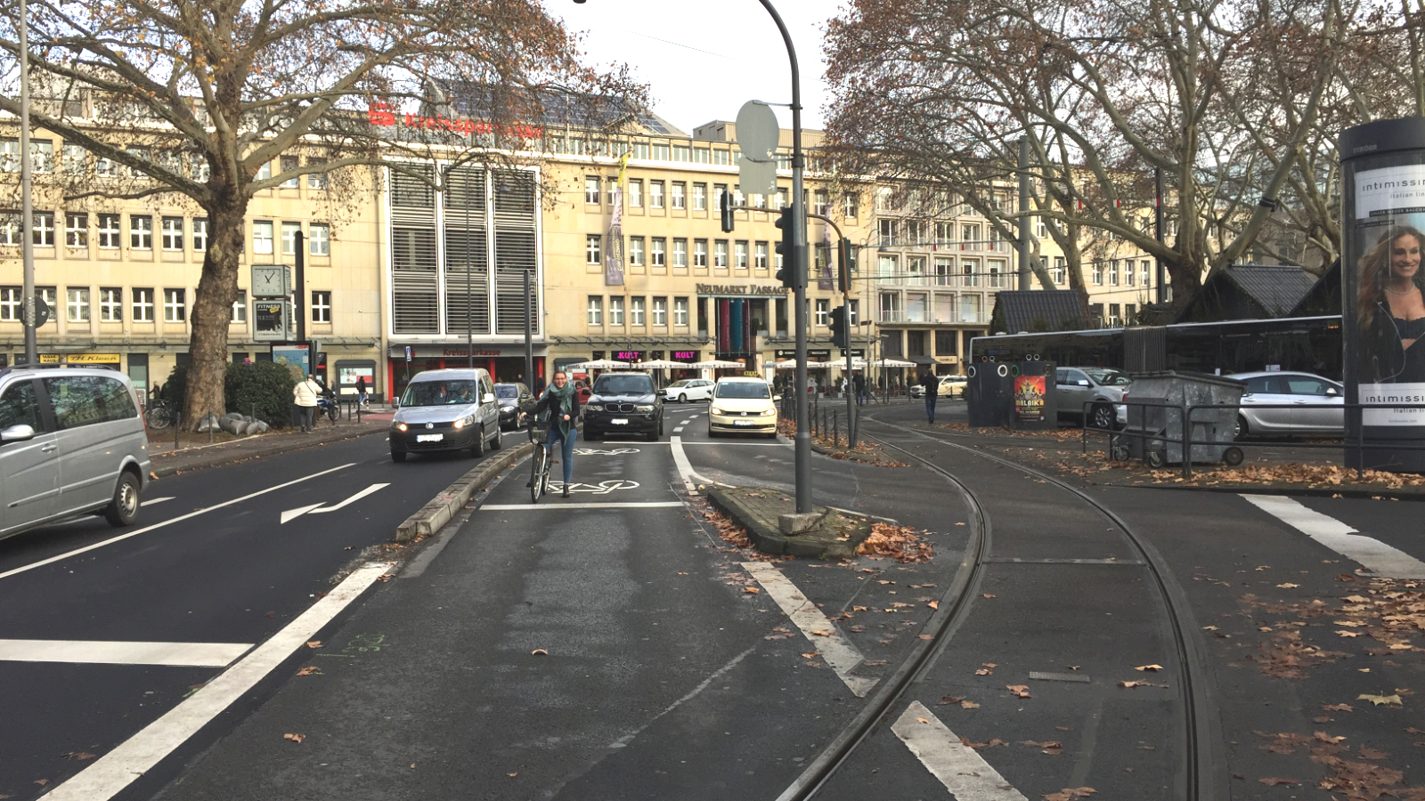 Im Zuge einer Fahrbahnerneuerung haben wir im August 2018 den Radschutzstreifen aus der Straße Am Malzbüchel, im Bereich der Handwerkskammer am Heumarkt, bis an das Rheinufer verlängert und damit den Straßenraum zugunsten des Radverkehrs neu aufgeteilt. Auch haben wir für Radfahrende das direkte Linksabbiegen in den Tunnel unter dem Maritim Hotel möglich gemacht. Dafür haben wir eine der beiden bisherigen Linksabbiegespuren ausschließlich dem Radverkehr zur Verfügung gestellt.