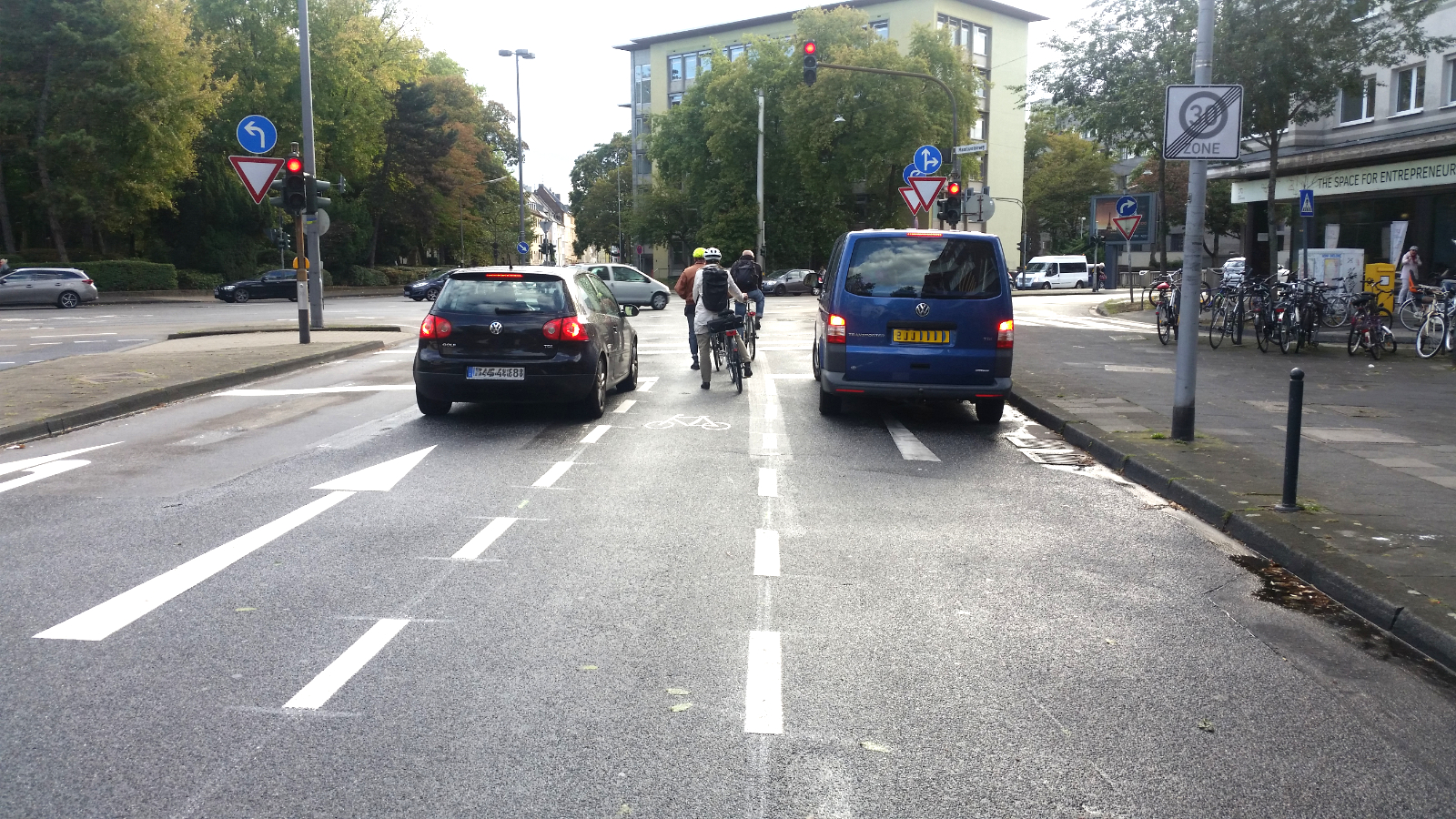 Im September 2018 haben wir an der Kreuzung Rothgerberbach im Vorgriff auf die Einrichtung der Nord-Süd-Fahrradstraßenachse auf den Zufahrten Am Weidenbach und Griechenpforte vorgezogene Aufstellflächen für den Radverkehr markiert.