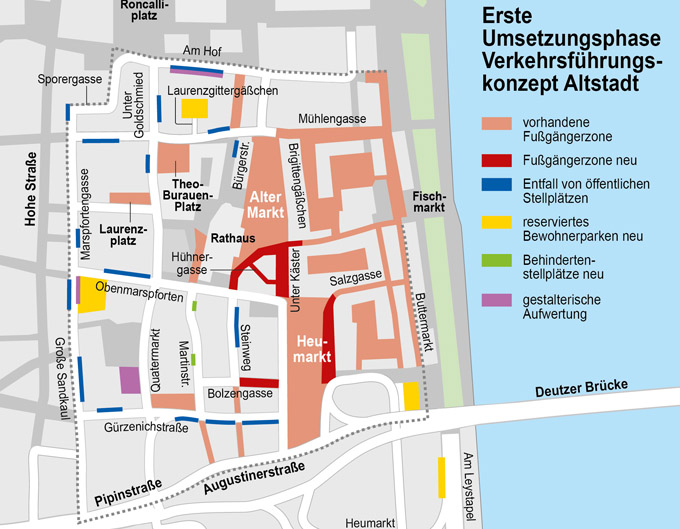 Der erste Umsetzungsschritt des Verkehrsführungskonzeptes Altstadt hat mehr als nur Signalwirkung. Wir schaffen Platz für Fahrräder und Fußgängerinnen und Fußgänger und leisten einen deutlichen Beitrag zur Verbesserung der Luftqualität. Wir machen den öffentlichen Raum attraktiver und stärken die Kölner Altstadt langfristig. Das Verkehrsführungskonzept Altstadt weist den Weg zu mehr Platz für Fußgängerinnen, Fußgänger und Fahrradfahrende, genauso wie es lebenswerte Städte, etwa Kopenhagen oder Zürich, umsetzen. Es legt den Grundstein für mehr Lebensqualität im Herzen der Kölner Innenstadt und macht ihre vielen historischen und architektonischen Schätze auf der Via culturalis erlebbar.